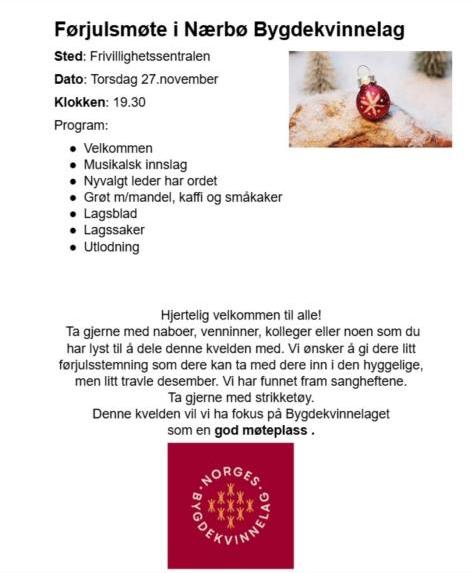 Forside Nov 27 Thu Nærbø Bygdekvinnelag Førjulsmøte Frivillighetssentralen, Nærbø tor 27.11.2025 19:30 Hjertelig velkommen til førjulsmøte Del på: