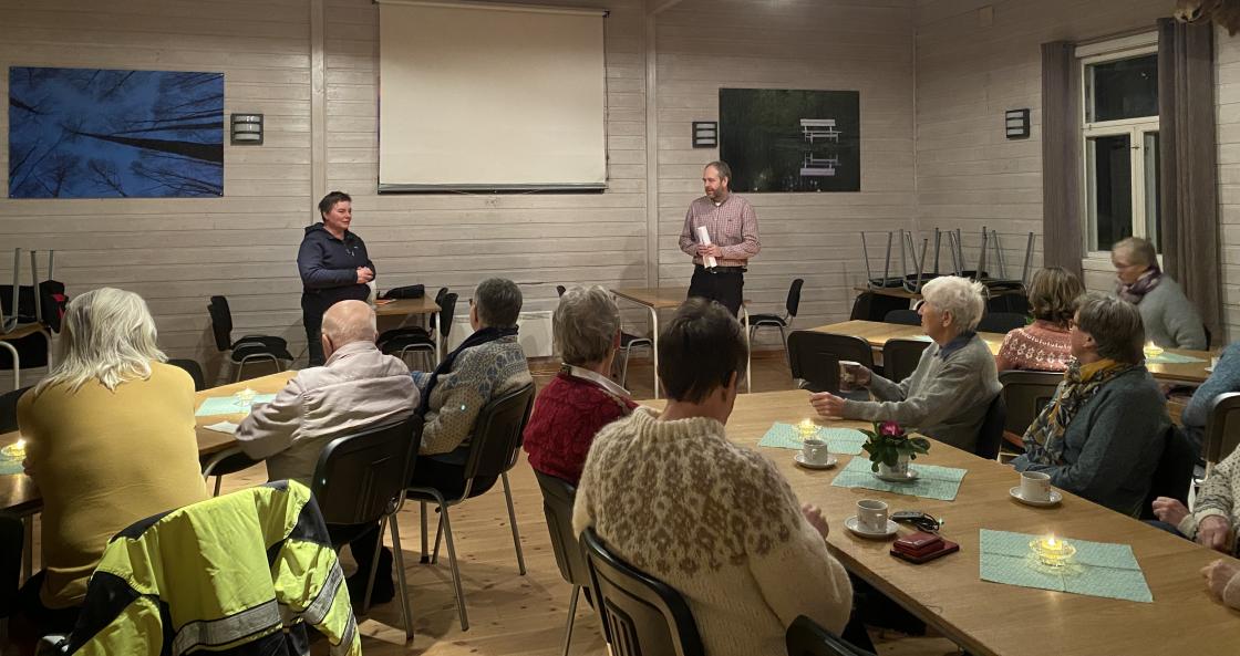 Solveig ønsket velkommen til de 12 stk som hadde møtt opp for å høre på Øystein Haugen fortelle og vise natur og blomsterbilder fra Holleia og fortelle om den jobben de har gjort på Gunnhusvollen.