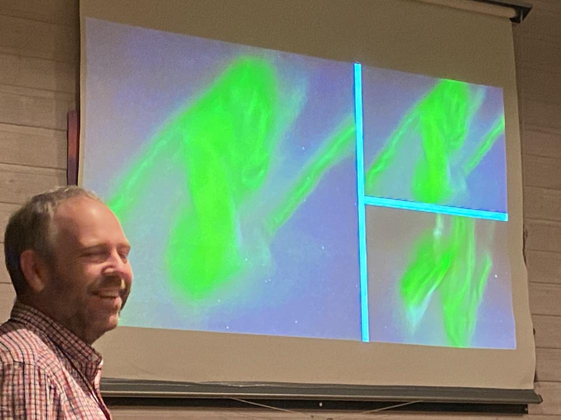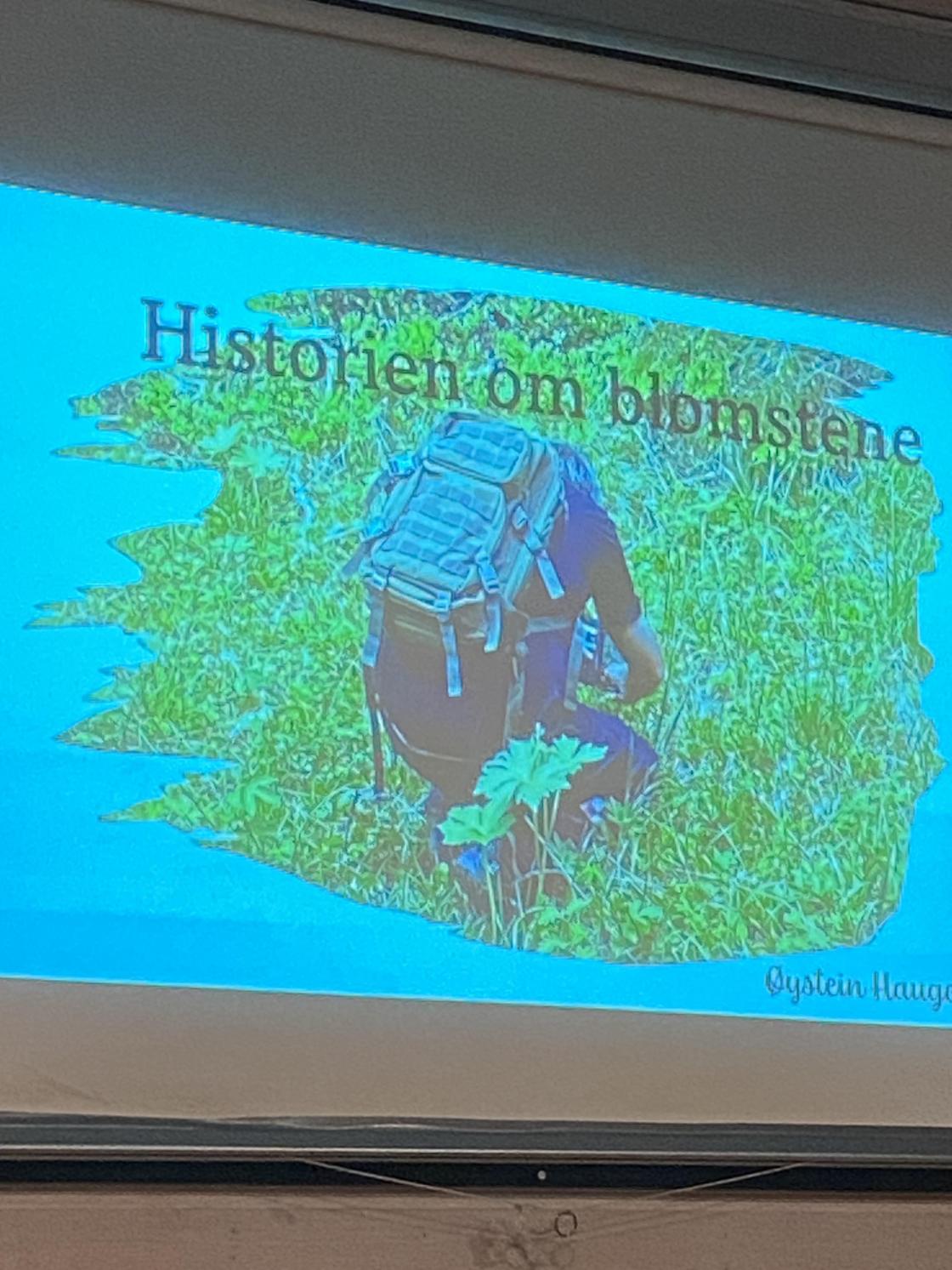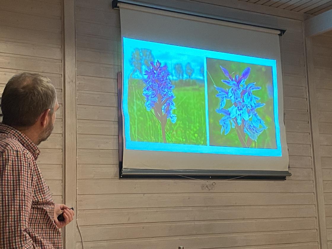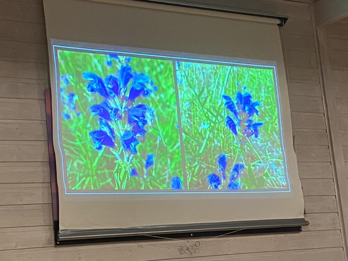 Vi fikk se masse flotte bilder som en årsgjennomgang av naturen på og rundt setra i Holleia. Det var også med masse flotte bilder av blomster som har kommet opp igjen i denne slåttemarka på setra, som er inngjerdet for å hindre kuer og sauer fra å beite den ned for tidlig på sommeren. Det er viktig å slå marka litt sent på sensommeren slik at blomstene får tid til å sette frø.