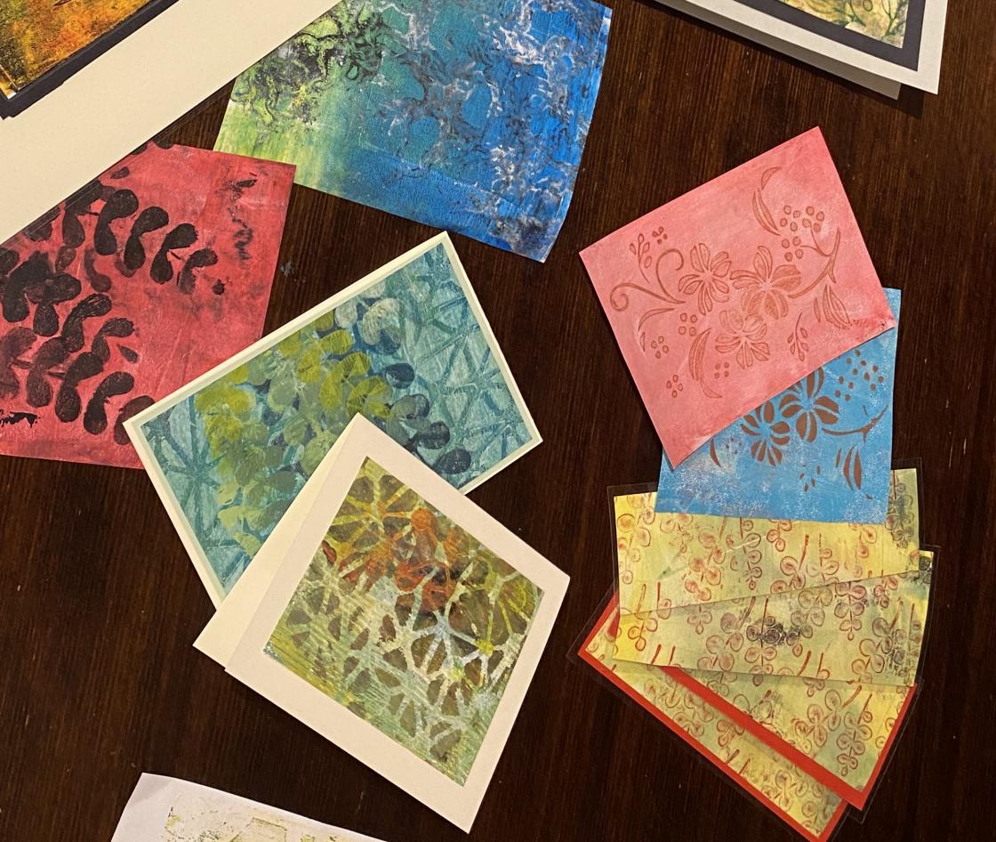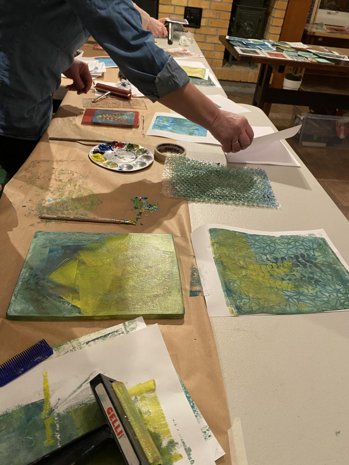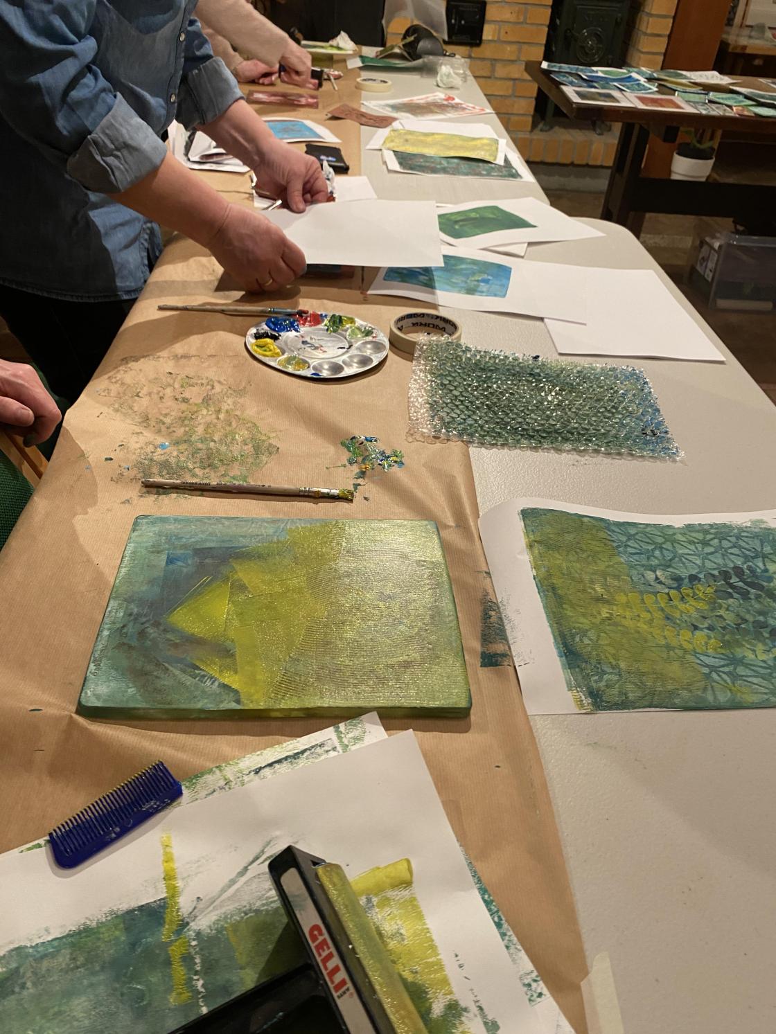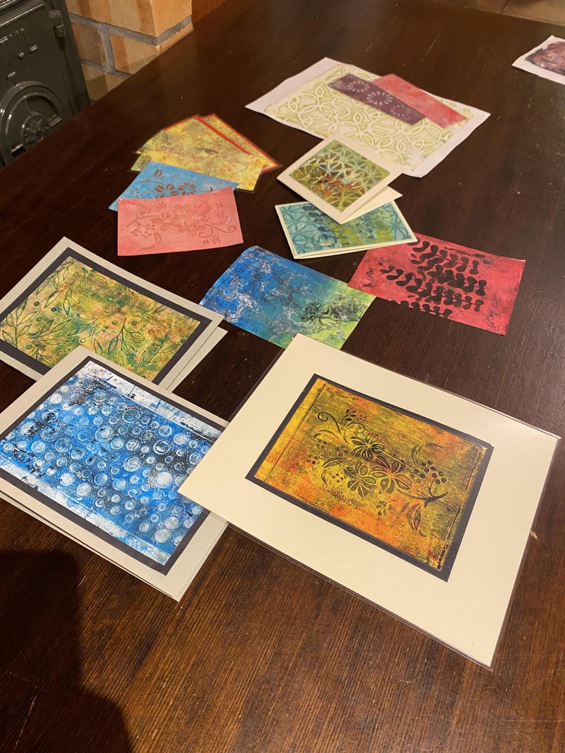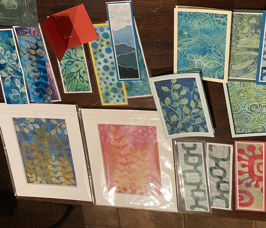 Gelliprinting viste seg å være veldig gøy. Det ble laget bilder, kort og bokmerker.