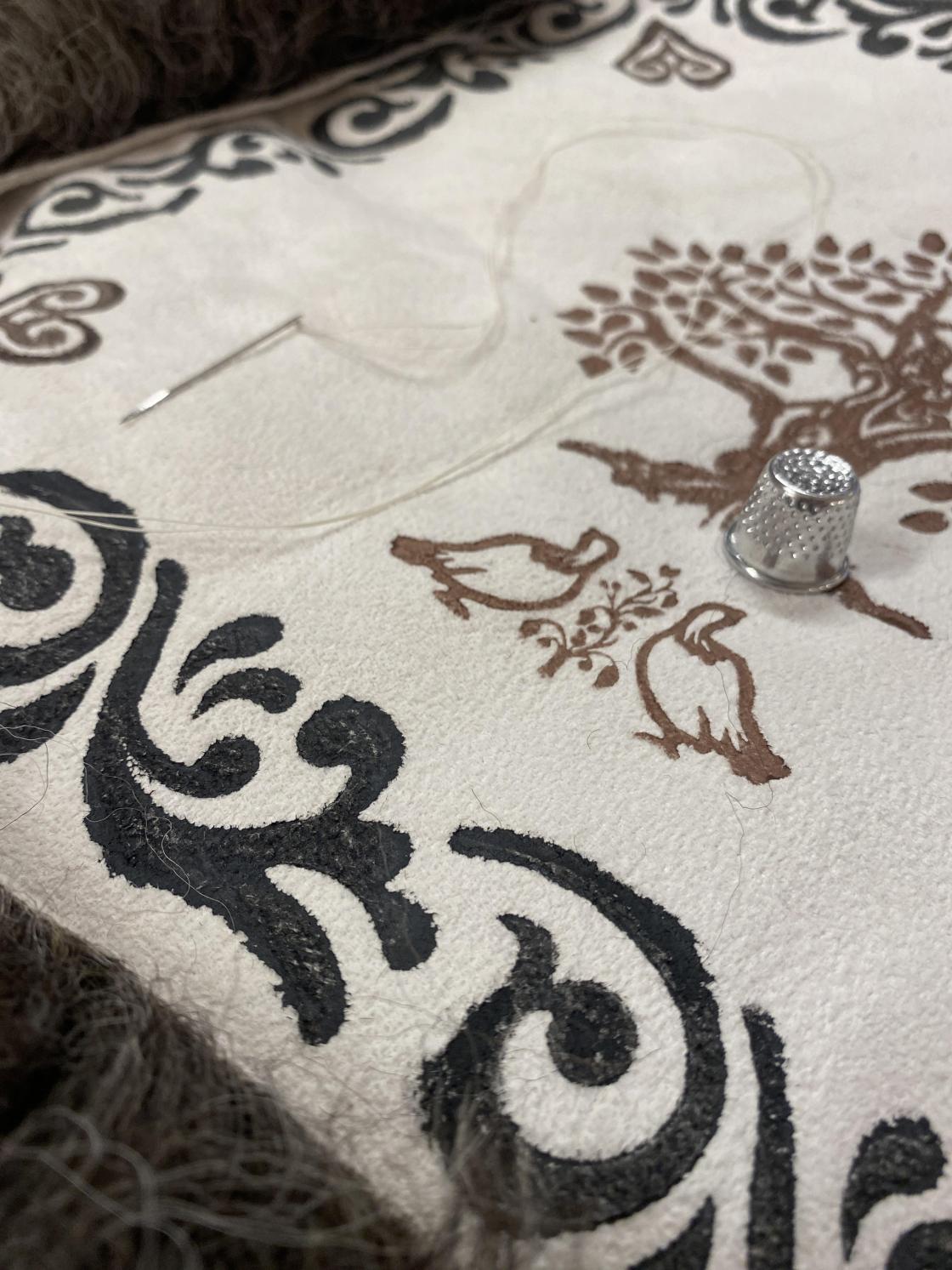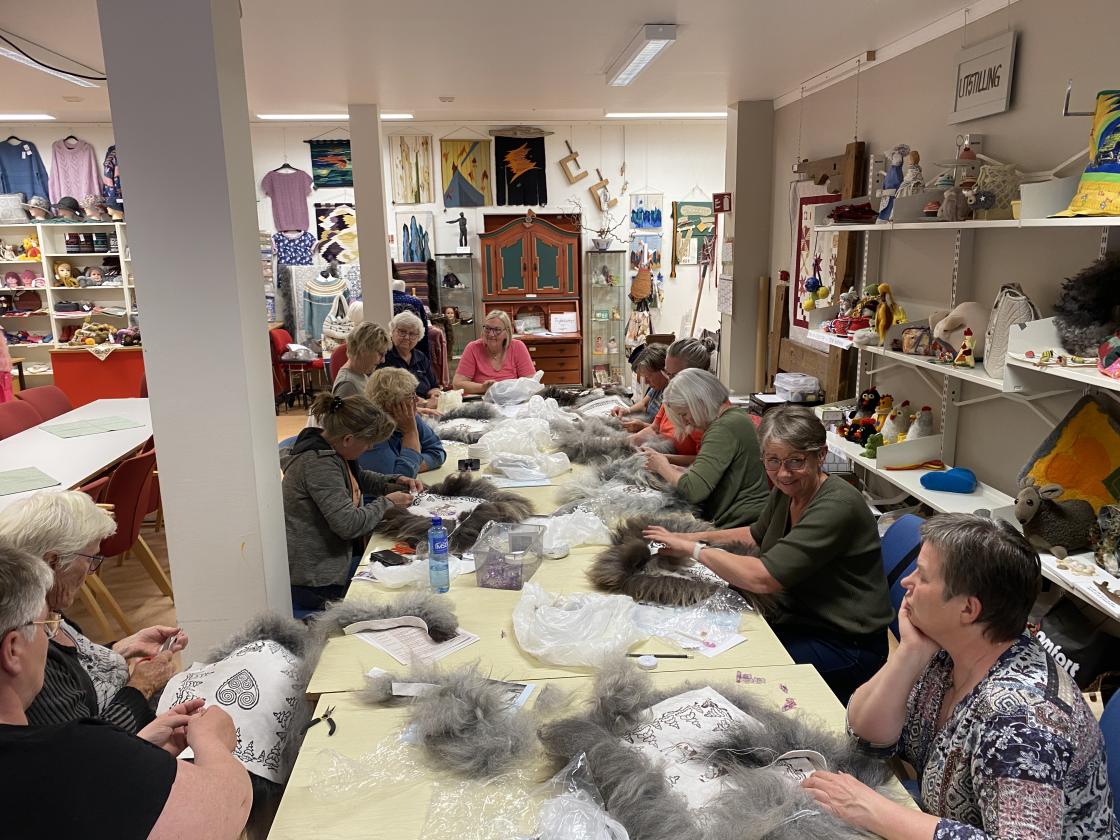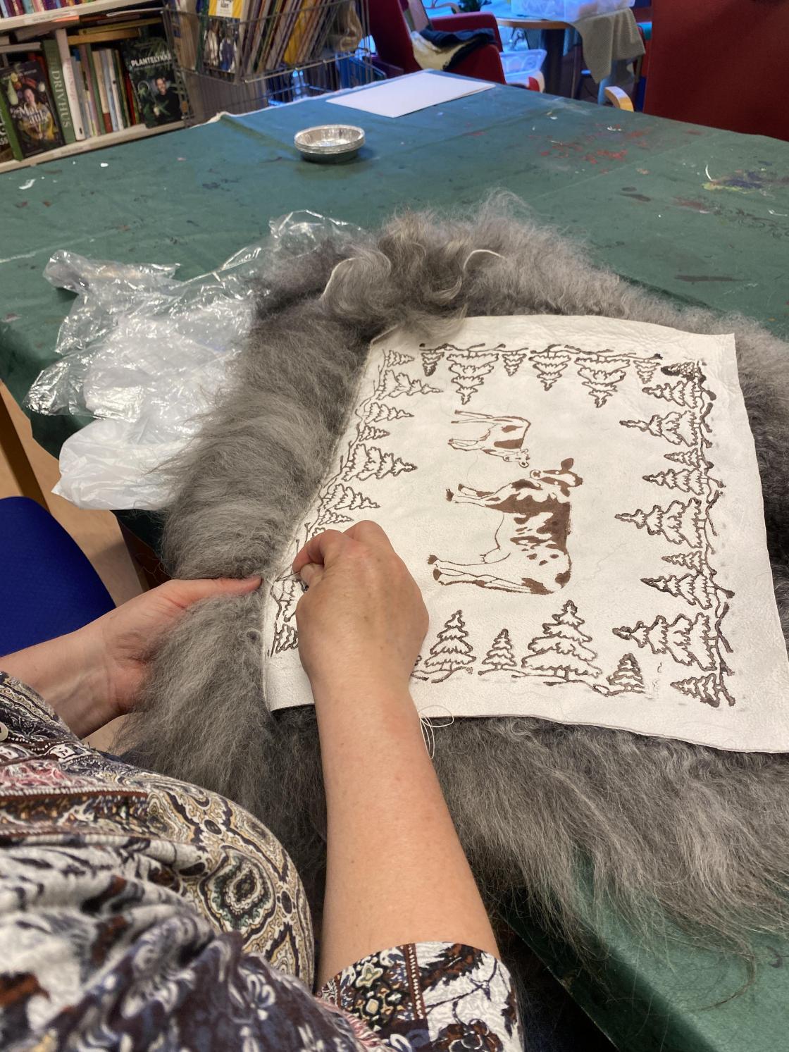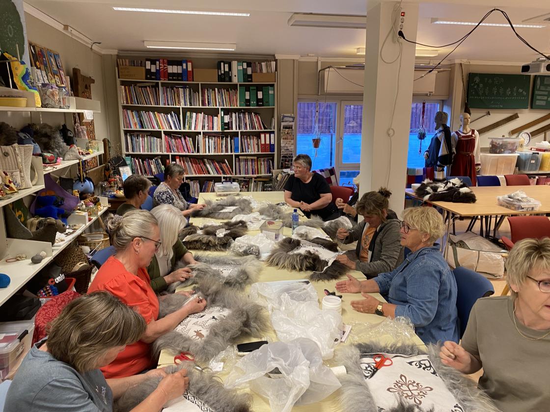 Flott norske skinnfeller skulle trykkes og sys på brudekant. Fellene hadde de dyktige instruktørdamene klippet ferdig til oss før vi kom. Vi fikk instruksjoner og så var det å begynne - velge trykkemønster ble vanskelig da det var så mye å velge i men vi kom nå igang alle sammen. Det ble mange varianter og ingen like! Så kom det som viste seg å være litt mer jobb - tre nål, vokse tråden og så sy i skinnfellen. Det var godt med fingerbøller og også til tider tang for å få dratt nålen gjennom. Men med tålmodighet og standhaftighet så fikk vi alle sydd oss rundt fellen.
