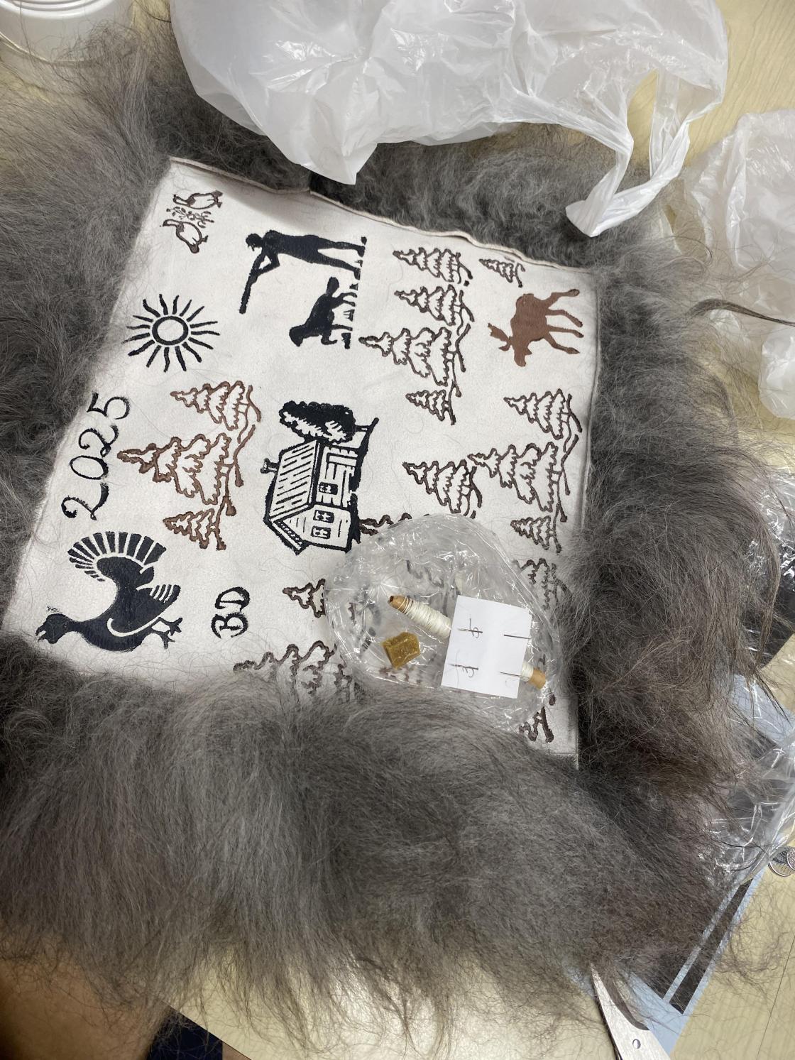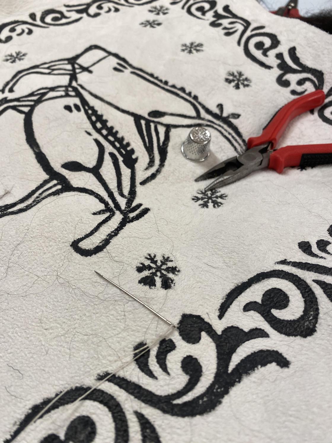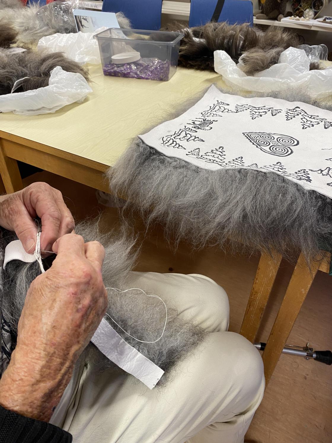 Flott norske skinnfeller skulle trykkes og sys på brudekant. Fellene hadde de dyktige instruktørdamene klippet ferdig til oss før vi kom. Vi fikk instruksjoner og så var det å begynne - velge trykkemønster ble vanskelig da det var så mye å velge i men vi kom nå igang alle sammen. Det ble mange varianter og ingen like! Så kom det som viste seg å være litt mer jobb - tre nål, vokse tråden og så sy i skinnfellen. Det var godt med fingerbøller og også til tider tang for å få dratt nålen gjennom. Men med tålmodighet og standhaftighet så fikk vi alle sydd oss rundt fellen.