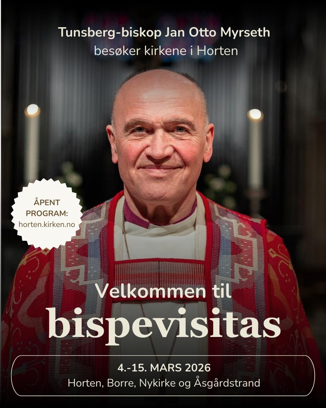 Torsdag 12. mars kommer biskop i Tunsberg, Jan Otto Myrseth, på visitas til Nykirke. Det starter med frokost i kirkestua i samarbeid med Nykirke Bygdekvinnelag. Alle er hjertelig velkommen til å bli med.