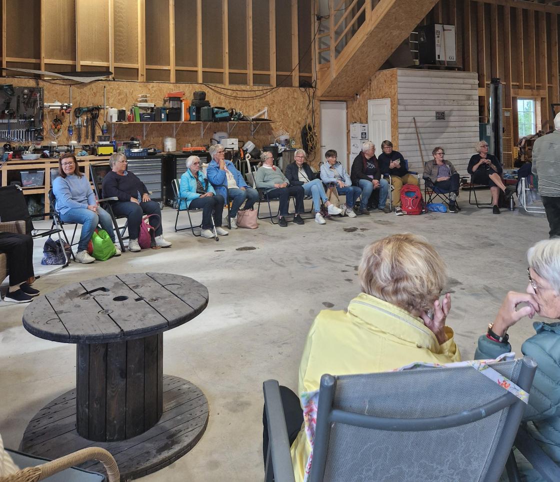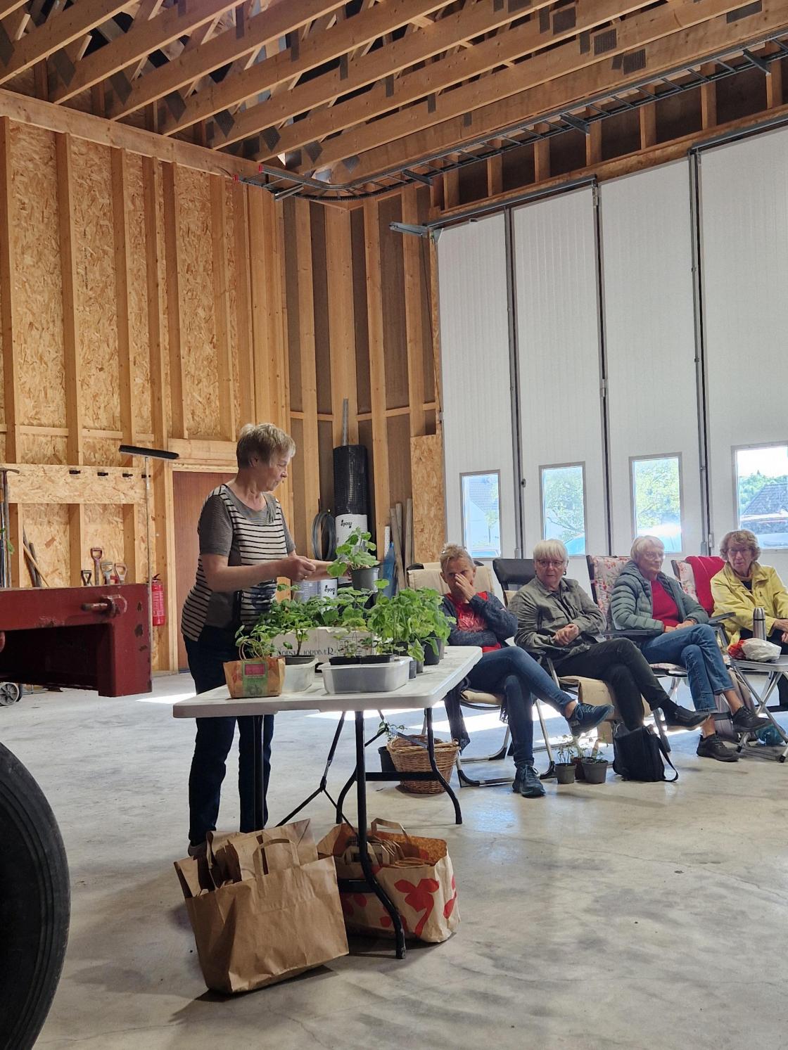 som benket seg rundt i driftsbygningen på gården til Aas-Haug med medbrakte stoler, kaffe og noe å bite i mens plantene ble budt fram.