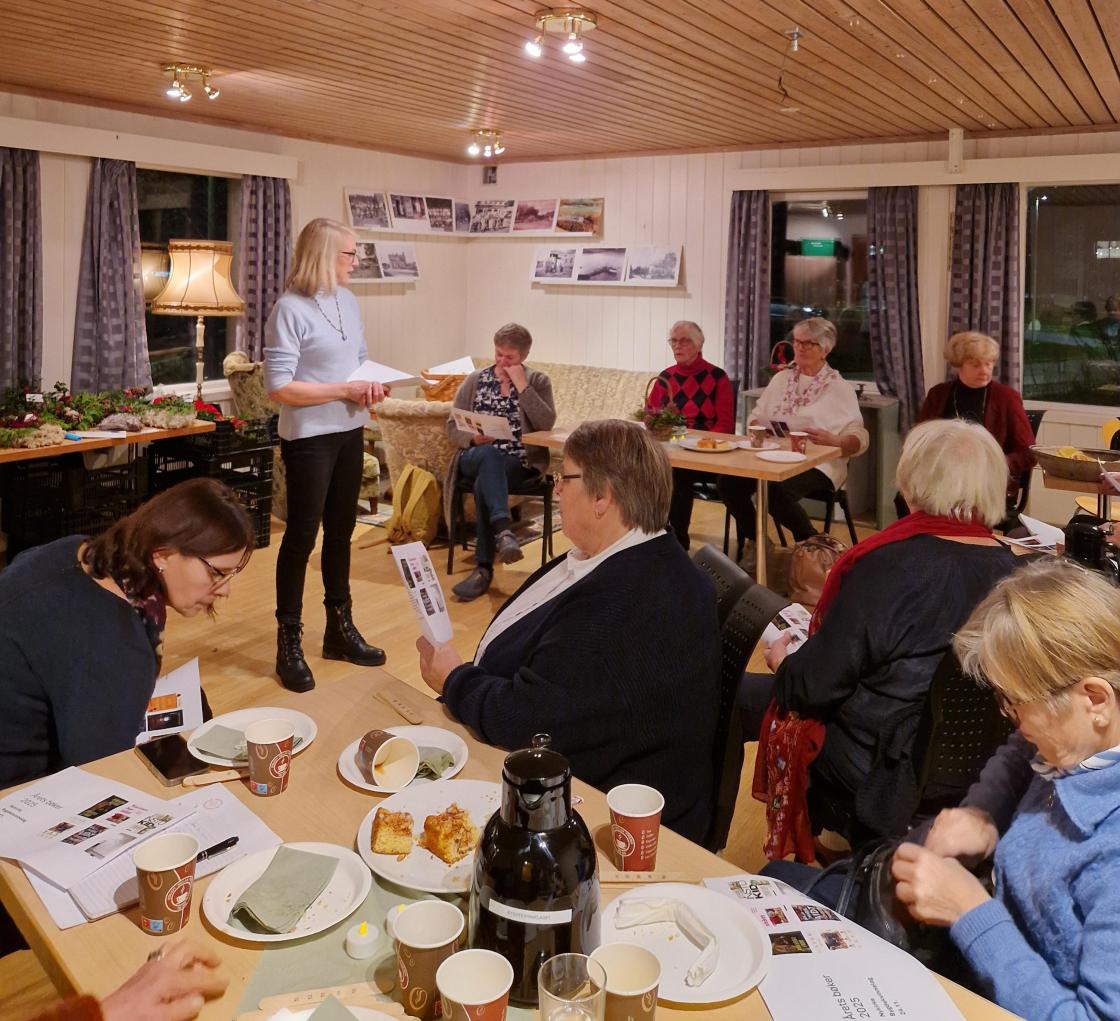 Det ble servert kaffe , eplekake og kanelknuter som vertinnene Ellen Andreassen og Anne Louise Solberg hadde bakt.