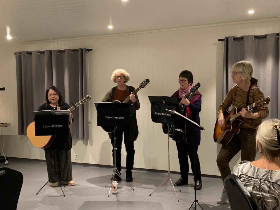 Fyrst hadde vi underhalding av Da Capo jentene som spelte gitar og song for oss. Deretter vart det servert snittar, kake og kaffi før vi gjekk vidare til gjennomføring av årsmøtet.
