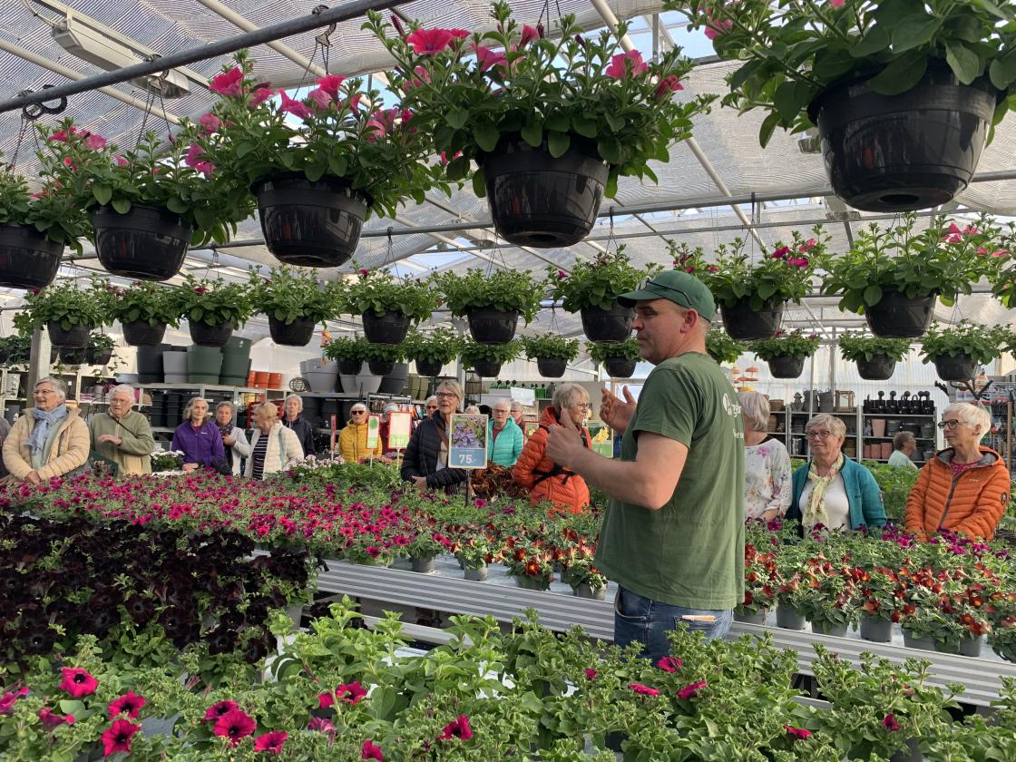 Rundt 50 damer møtte opp i Fredheim Gartneri i kveld. Her fekk vi omvisning av eigar og dagleg leiar Terje Hus. Besteforeldra hans starta drifta av hagesenteret og det fyrste drivhuset stod klart i 1947.