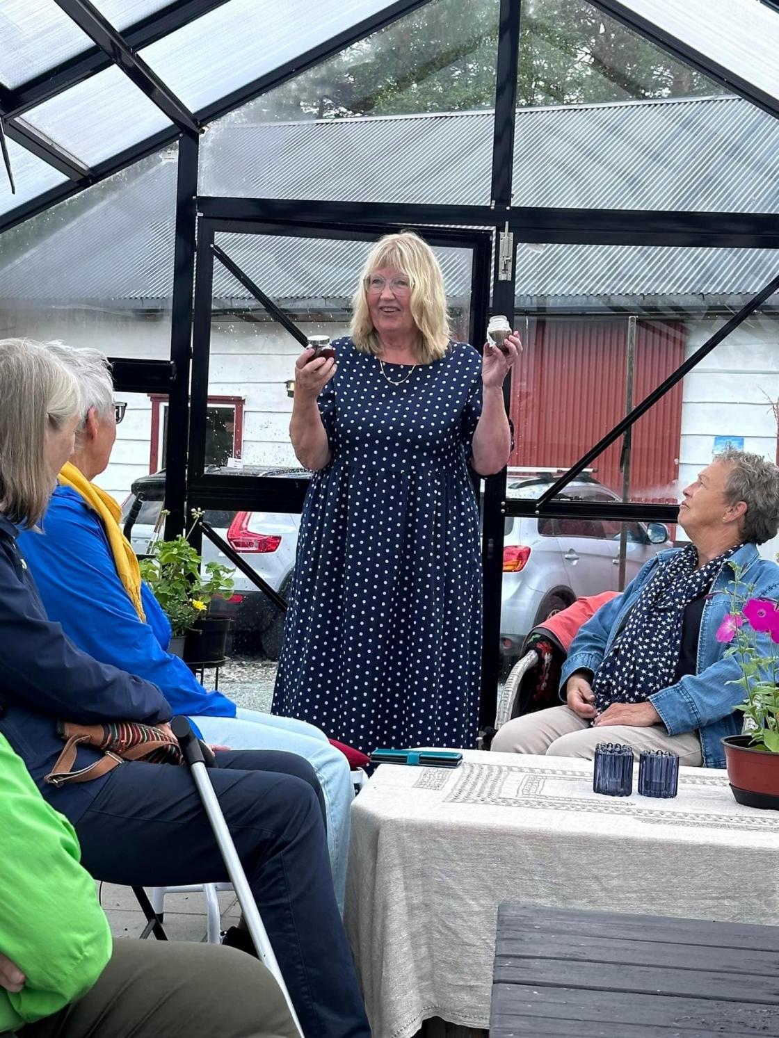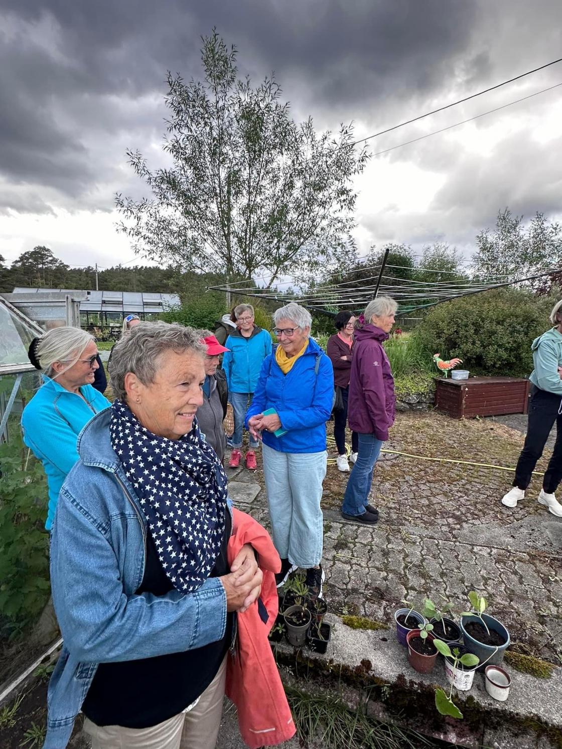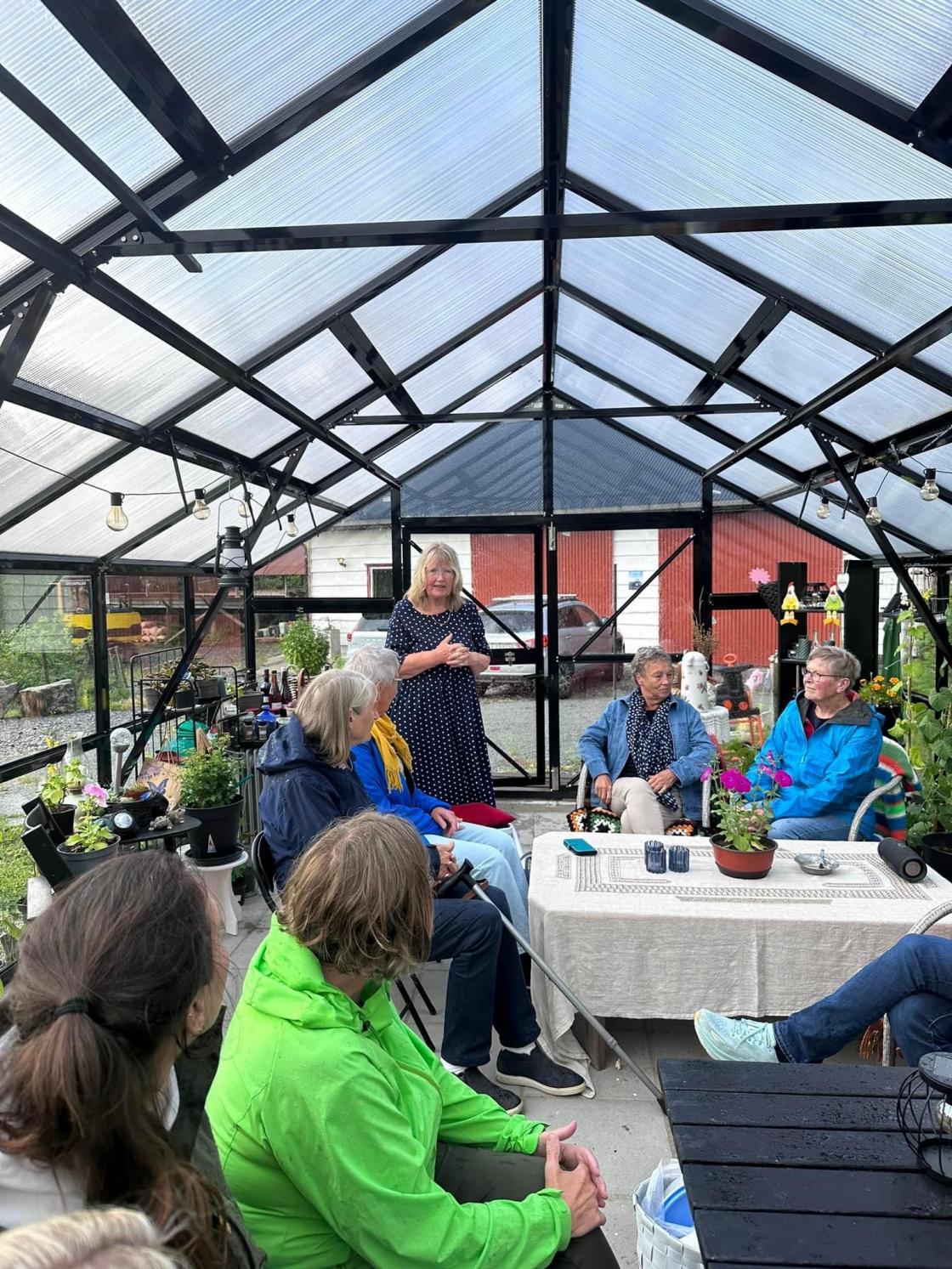 Torsdag 30. mai var ein gjeng med kjekke damer frå Omvikdalen bygdekvinnelag på besøk hos Magrete Ask på Hatlestrand. Me vart raust ynskt velkomne og tekne med rundt i den spanande hagen på Ask. Mange ulike planter og trær, pryd- og nyttevekster var det der. Veksthus, paviljonger og hytte var sett opp rundt bustadhuset. Noko for kvar ein smak. Her kunne du slappa av attmed peisen, kikka på moskusender i dammen, nyta utsikten frå ein benk eller sitja godt i drivhuset og smaka på alt det gode som var «trylla» fram av tidlegare avlinger.