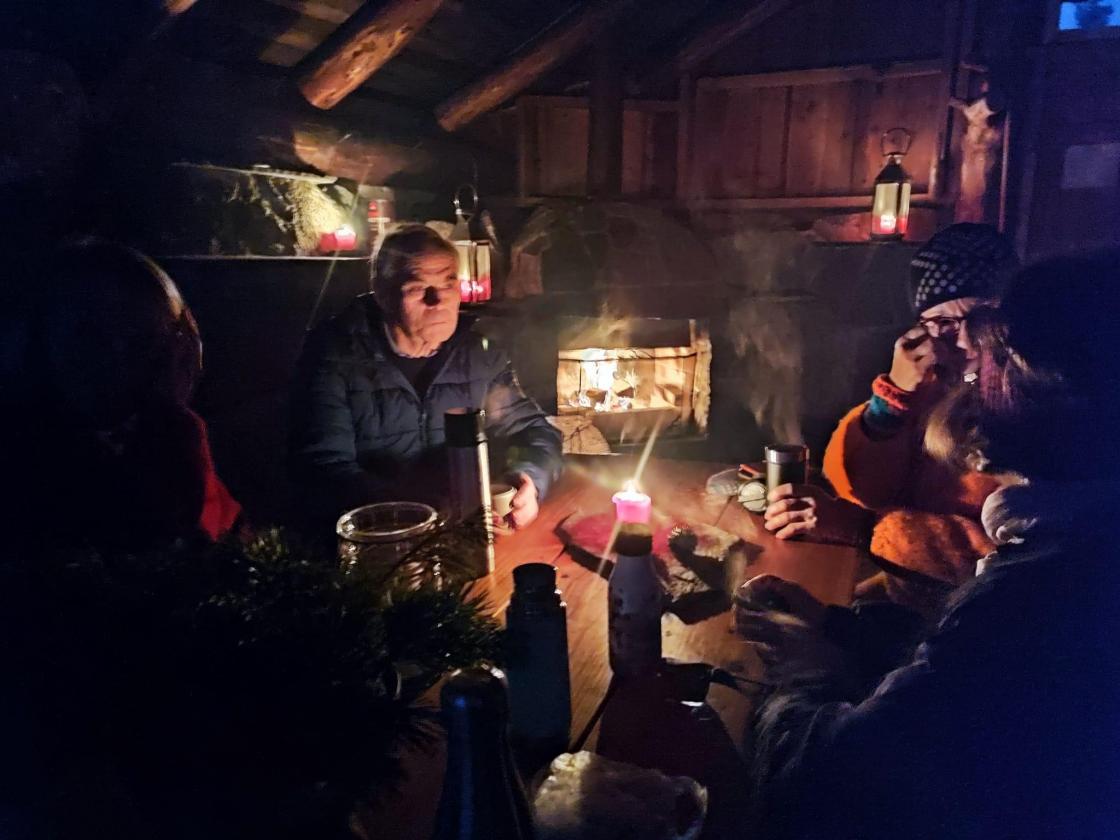 Fjorten bygdekvinner og ein mann tok turen til den fine dagsturhytta på Sjethaug der det var fyrt opp i peisen og tente lys gjorde det koseleg. Ei fin stund rundt langborda med kaffi og godt preik, før månemannen følgde oss på turen ned igjen.