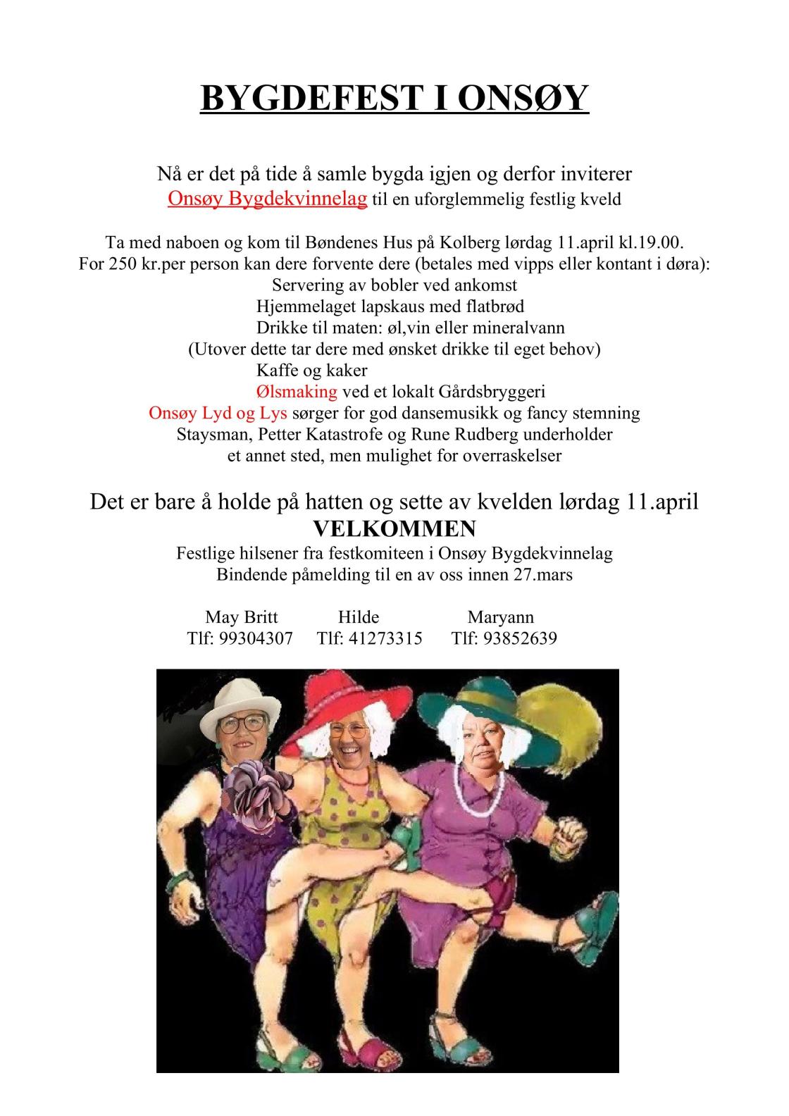 Forside Om Onsøy Bygdekvinnelag Styret Vårens møteplan 2026 Årsmøte protokoller Årsmeldinger Vevstua Apr 11 Sat Onsøy Bygdekvinnelag BYGDEFEST Bøndenes Hus Onsøy lør 11.04.2026 19:00 - søn 12.04.2026 01:00 Del på: