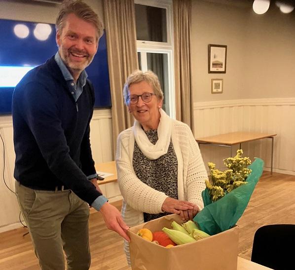 June Vallestrand takket Torbjørn med en eske med produkter fra Skauen Gård, og smilet hans gikk fra øre til øre.