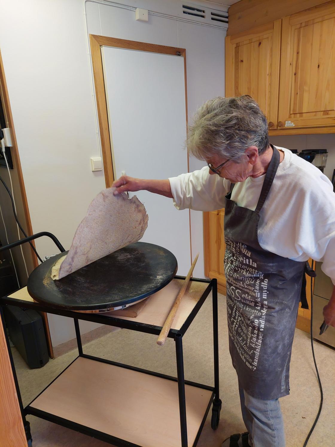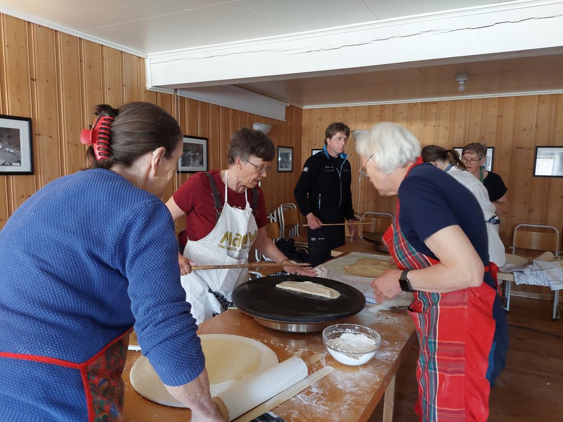 Dagen starta med at Tanya viste oss korleis me laga knåa til potetlefsene. Deltakarane vart sett i sving med å pressa potetene i potetpressa. Så vart det blanda inn smelta smør, mjølk, sukker, salt og til slutt passe mykje mjøl til ei god knåa.