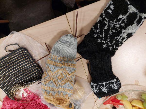 Det var fleire som strikka sokkar, og eit par unge jenter fekk kyndig hjelp med hælfellinga ![]()