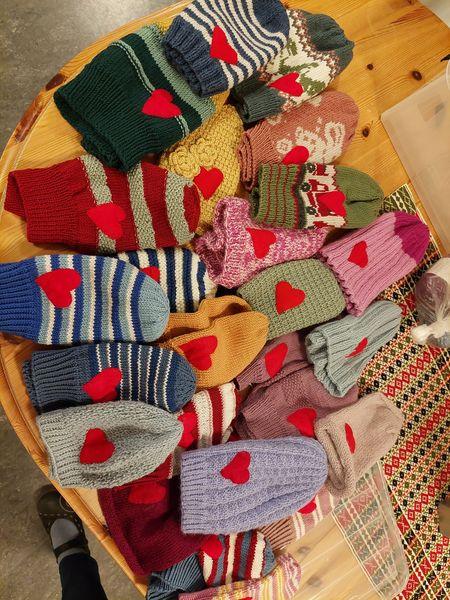 Me hadde ein liten dugnad med å sy på hjarte på huene som skal delast ut til førsteklassingane på skulen på Sundve.