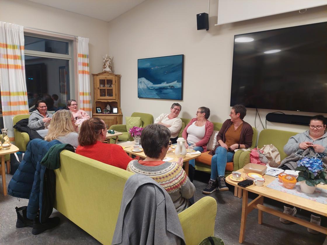 18 damer var samla denne kvelden. Her vart det strikka, hekla og brodert. Og praten gjekk livleg rundt borda ![]()