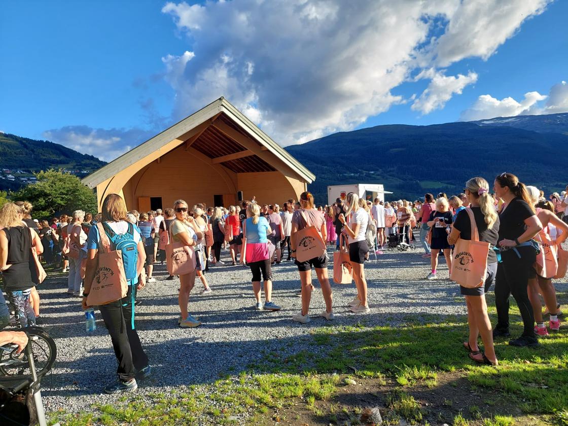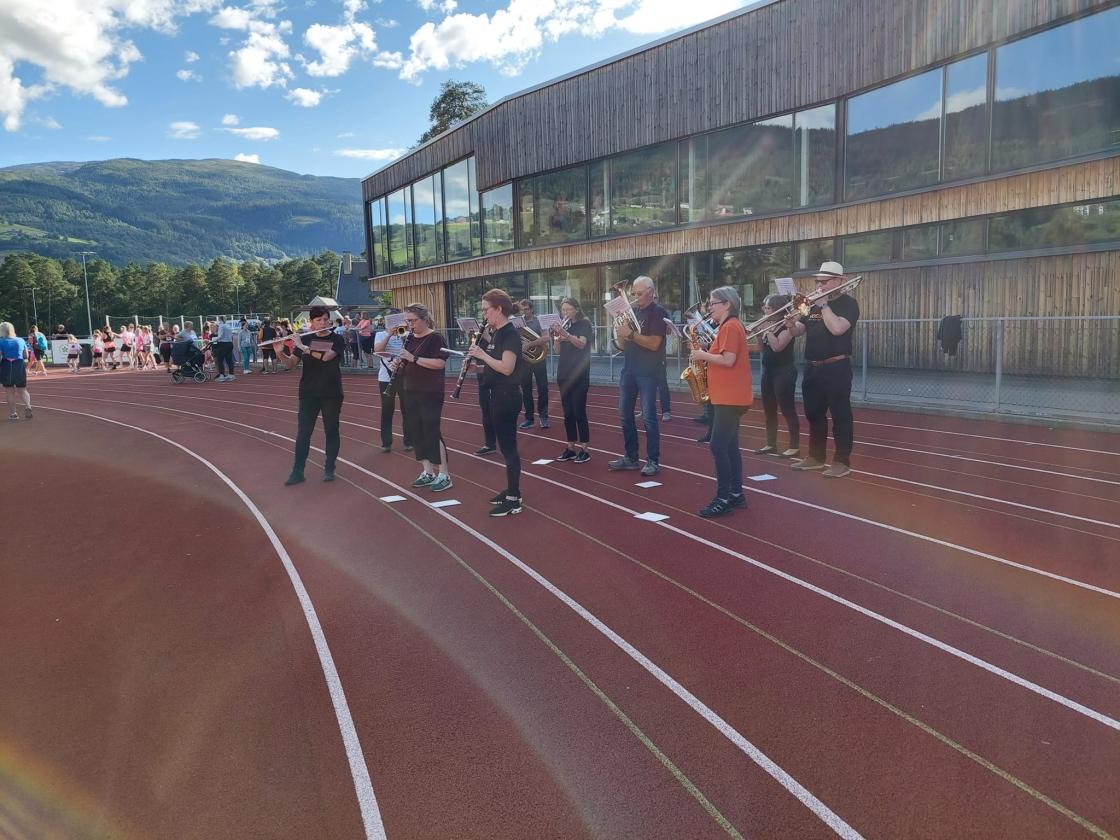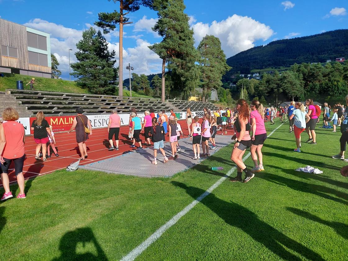 Sigfrid Naasen er klar for å leia oppvarminga før start 😅 Ho er nett lika spretten, energisk og entusiastisk som underteikna hugsar ho som gymlærar på Voss Gymnas for 40 år sidan