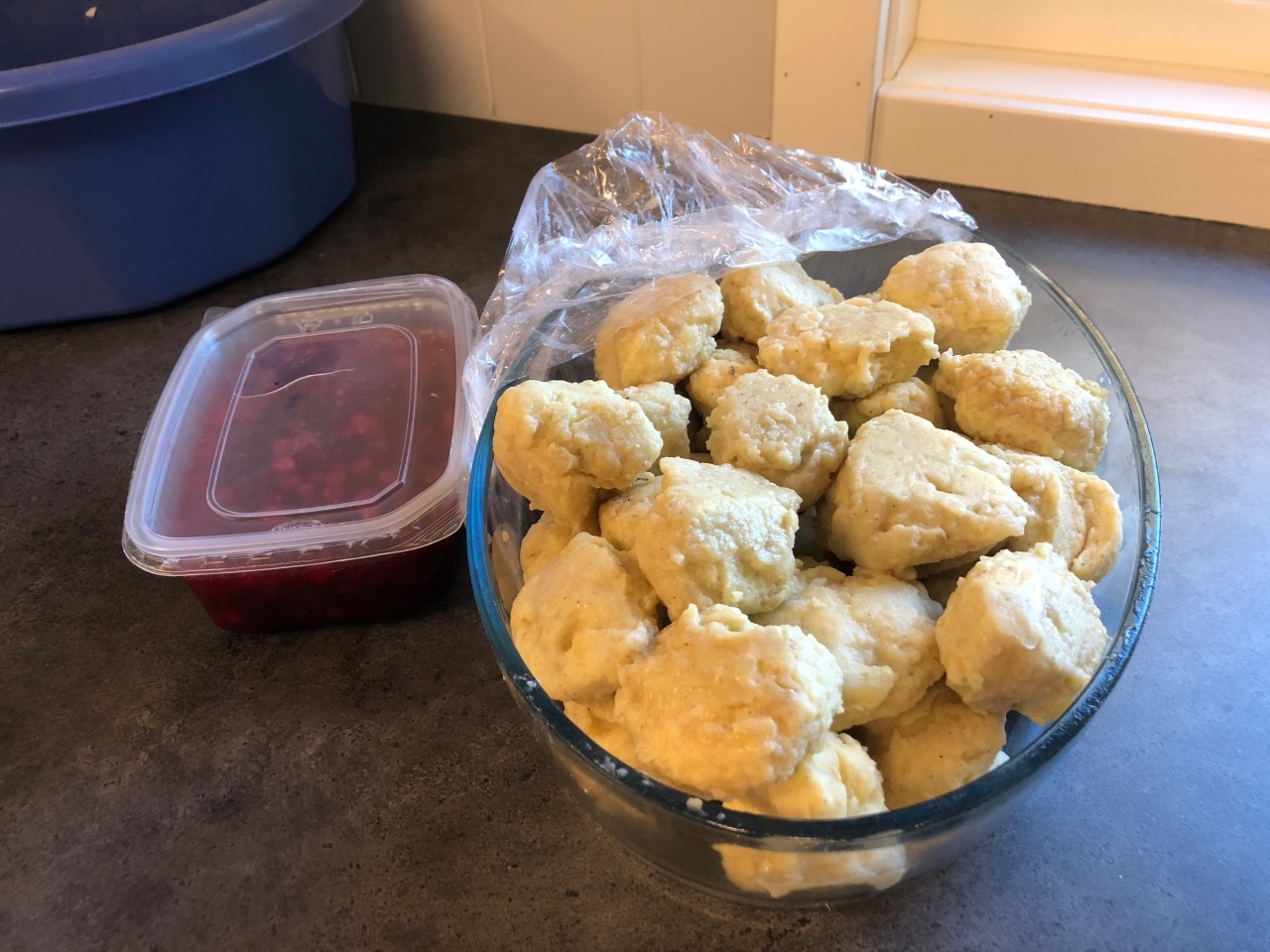 Egg og sukker piskes lett. Ha i melk, kardemomme og mel. Lag bollene med to spiseskjeer og ha dem i suppa. Trekkes i suppa ca ½ time.