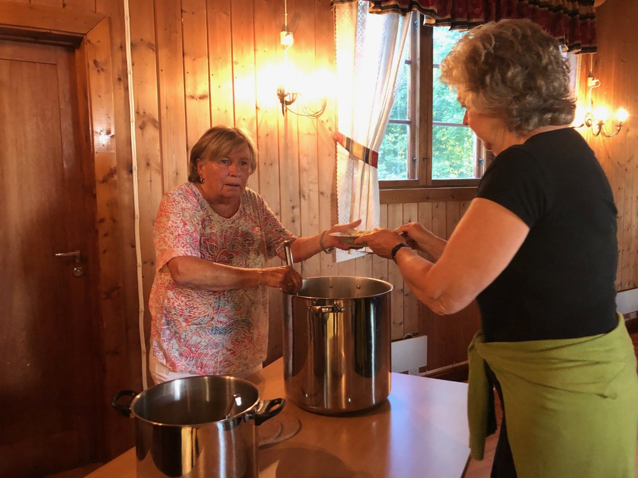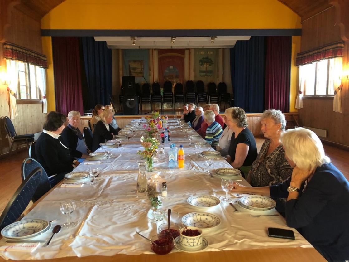 Maten ble laga av 13 personer, og det ble dekket til med langbord i storsalen. Åtte til dukka opp så vi til sammen ble en fin gjeng med 21 damer til maten. Under måltidet gikk praten om «løst og fast», i tillegg til at suppa med tilbehør ble tema. Hva foretrekker du? Melboller eller boller med potet, sur-søt saus eller pepperrotsaus? Uansett favoritt, måltidet ble avslutta med en velfortjent applaus til kokkene!