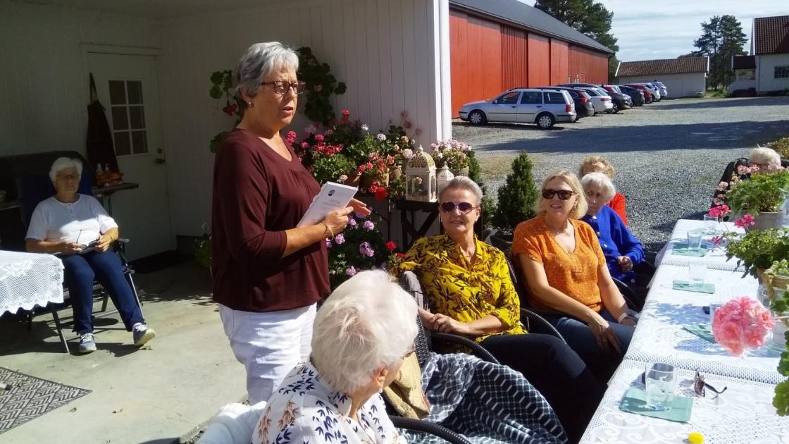 Endelig kunne vi møtes igjen! Lørdag 28. august samlet 18 bygdekvinner seg i hagen hos Ane Grøndahl for å høre Anny Sagen fortelle om lyrikksamlingen sin og lese fra den.