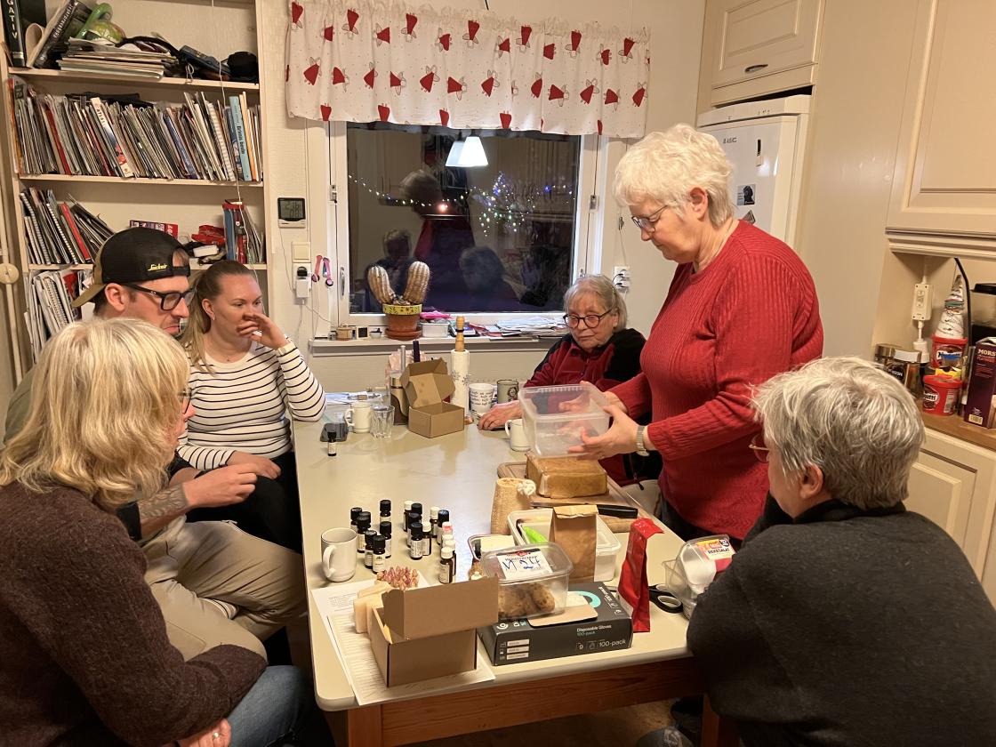 Eva Øvren guidet kursdeltakerne kyndig gjennom tilvirkning av såpestykker ved bruk av kaustisk soda, vann, oljer og tilsetninger som eteriske oljer, planter og kaffe. Prosessen kalles "kald prosess", men innebærer håndtering av varme ingredienser og god temperaturkonroll. Vi laget seks ulike såpetyper, lærte gode sikkerhetsrutiner og fikk gode tids ifht bearbeiding og etterarbeid. Såpestykkene er ment å brukes til hender og kropp. Vi snakket også om miljøvennlige og naturlige alternativer til kles- og husvask.