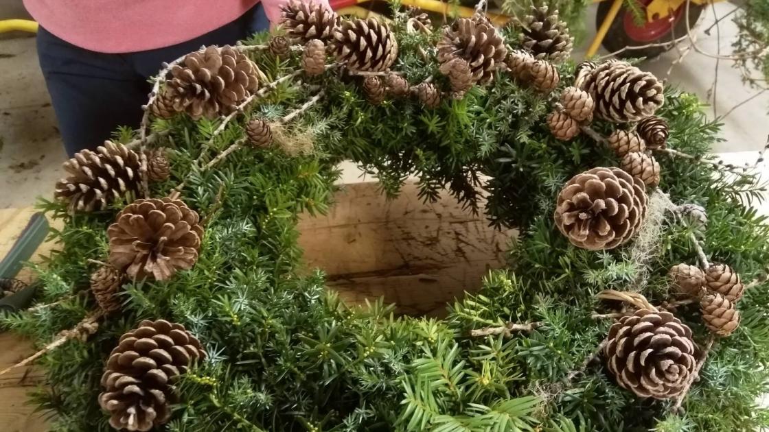 Det var kjøpt inn halmkranser, og mange hadde med seg forskjellige vintergrønne planter eller mose. Det var også skaffet masse kongler, og en kunne velge mellom å binde krans med bar eller annet, lime rene konglekranser, eller velge en mellomting.