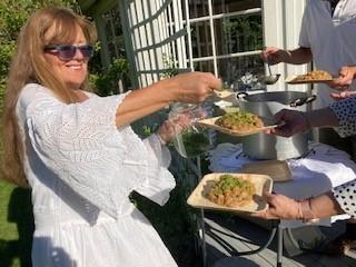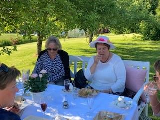 Hele 23 medlemmer møtte opp i flotte sommerhatter til en vakker sommerkveld i hagen på Aarneberg Gård. Vi dekket med hvite duker og sølv, og serverte våre gjester "rabarbra-bobler", "Bondens" hjemmelagede lapskaus og kaffe og kaker medbragt av styret.