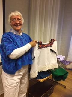 Vigdis Stapley har nettopp vært der borte, og hadde med varer som kvinner i Guatemala hadde vevd, brodert og sydd, og det var anledning til å kjøpe de fargerike plaggene. På bildet viser Vigdis fram en huipil, en typisk bluse fra Guatemala, den er brodert i flotte farger. Den hun selv har på, er vevd. Hun fortalte at disse plaggene var som bunad, forskjellig fra sted til sted. Hun ville få fram i sitt foredrag at kvinnene der viser fram fargerike klær, er opptatt samarbeid og sprer glede og varme. Guatemala er svært utsatt for naturkatastrofer, og Vigdis fortalte levende og engasjert, viste fram mange flotte bilder fra sine turer dit. En svært vellykka kveld for alle oss som møtte fram, vi hygget oss med kaffe og kaker, og Vigdis svarte villig på spørsmål. Inntektene fra loddsalget denne kvelden gikk til prosjektet «Kvinner i Guatemala « .