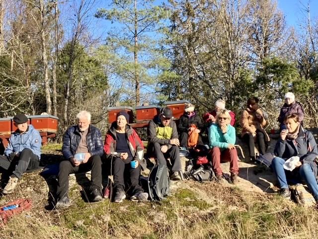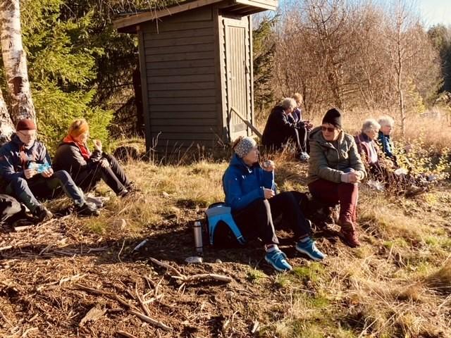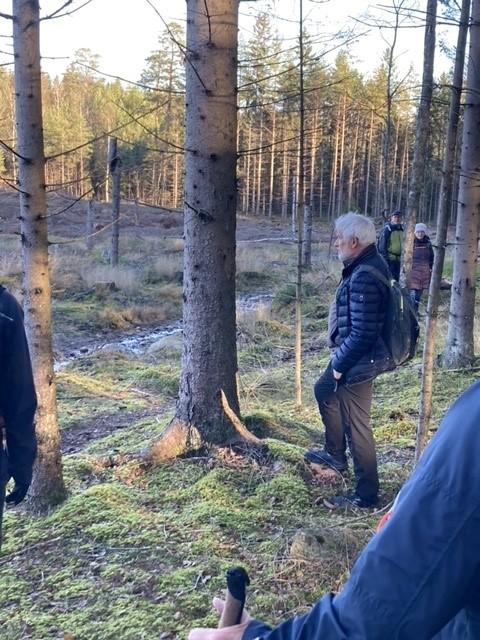 Vi hadde kaffe-rast ved Lavvo’n, og Asbjørn var guide og fortalte om husmannsplassen, kulturlandskapet, Tomb Mølle og Møllebekken hvor det er ørret.