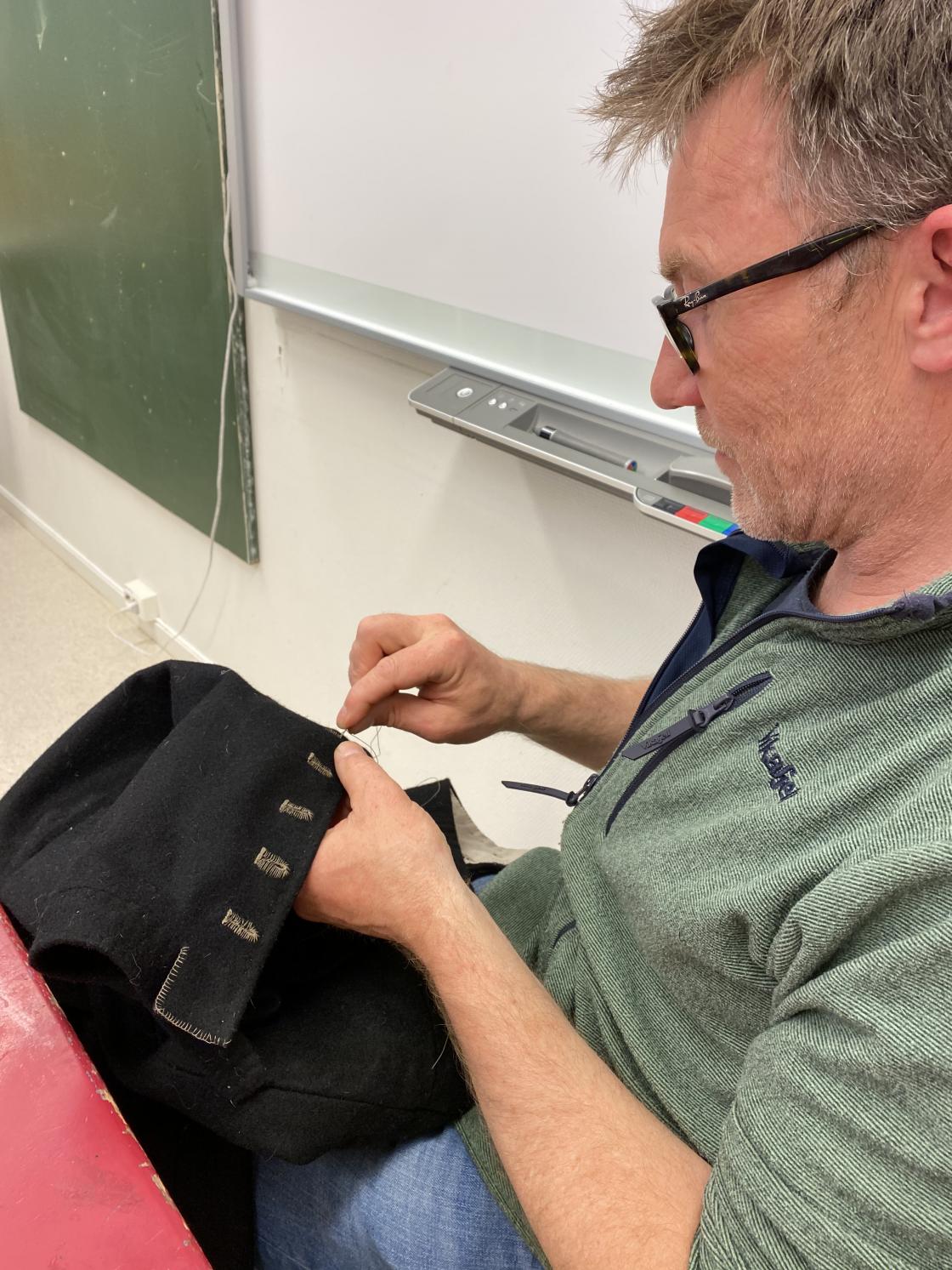 Patrick syr sin egen bunad. 6 mødre syr til sine sønner. Gjennom etterjulsvinteren har bunadene gradvis blitt til under kyndig veiledning av Anne Marit Oldertrøen og Else Løkken. Mellom kurskveldene har det vært hjemmelekser.