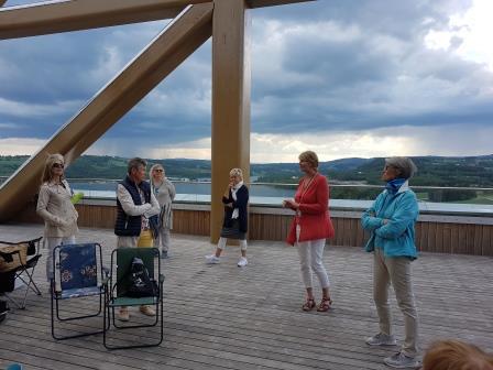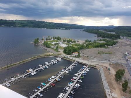 Som overraskelse på møtet var en kjentmann og da muligheten for og komme opp på den flotte verandaen i 18 etasje i Mjøstårnet. Stor takk til Lise for omvisning og orientering. Som kjent verdens høyeste trehotell så langt og hele 85,4 m. høyt. Det åpnet i mars 2019 og inneholder hotell, leiligheter, kontorer, restaurant, fellesområder og ikke minst svømmeanlegg. Mye av aktiviteten har sjølsagt vært laber nå i disse Corona tider, og mange restriksjoner hang fortsatt igjen, men når var det lov og kjøre heis – 3 stk om gangen. Vi hadde valgt en dag med laber bris i takene og regn og torden truet i horisonten. Utsikten der oppe i høyden var det imidlertid ikke noe og si på lell. Vi fikk gode muligheter for å gjøre seg litt kjent i Dala fra en heller ukjent vinkel for de fleste av oss. Riktig flott var det oppe på toppen.