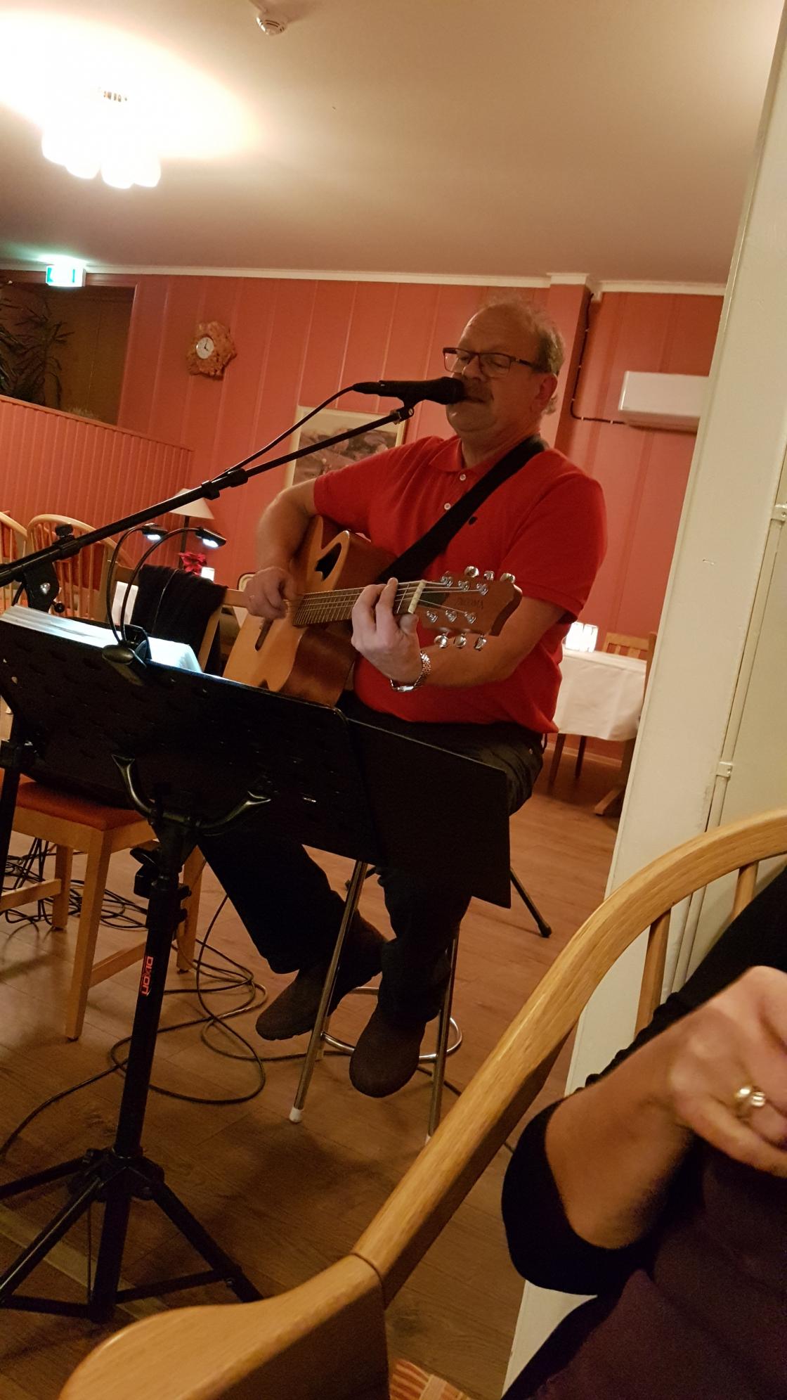 Etter maten var det tid for påfyll for musikalsk påfyll. Vår egen trubadur Kjell Erik Jacobsen spilte og sang og han hadde mange på reportoaret. Sjølsagt var det mange Prøysen viser, men også Sandbæk og Vandrarne fra Stange.