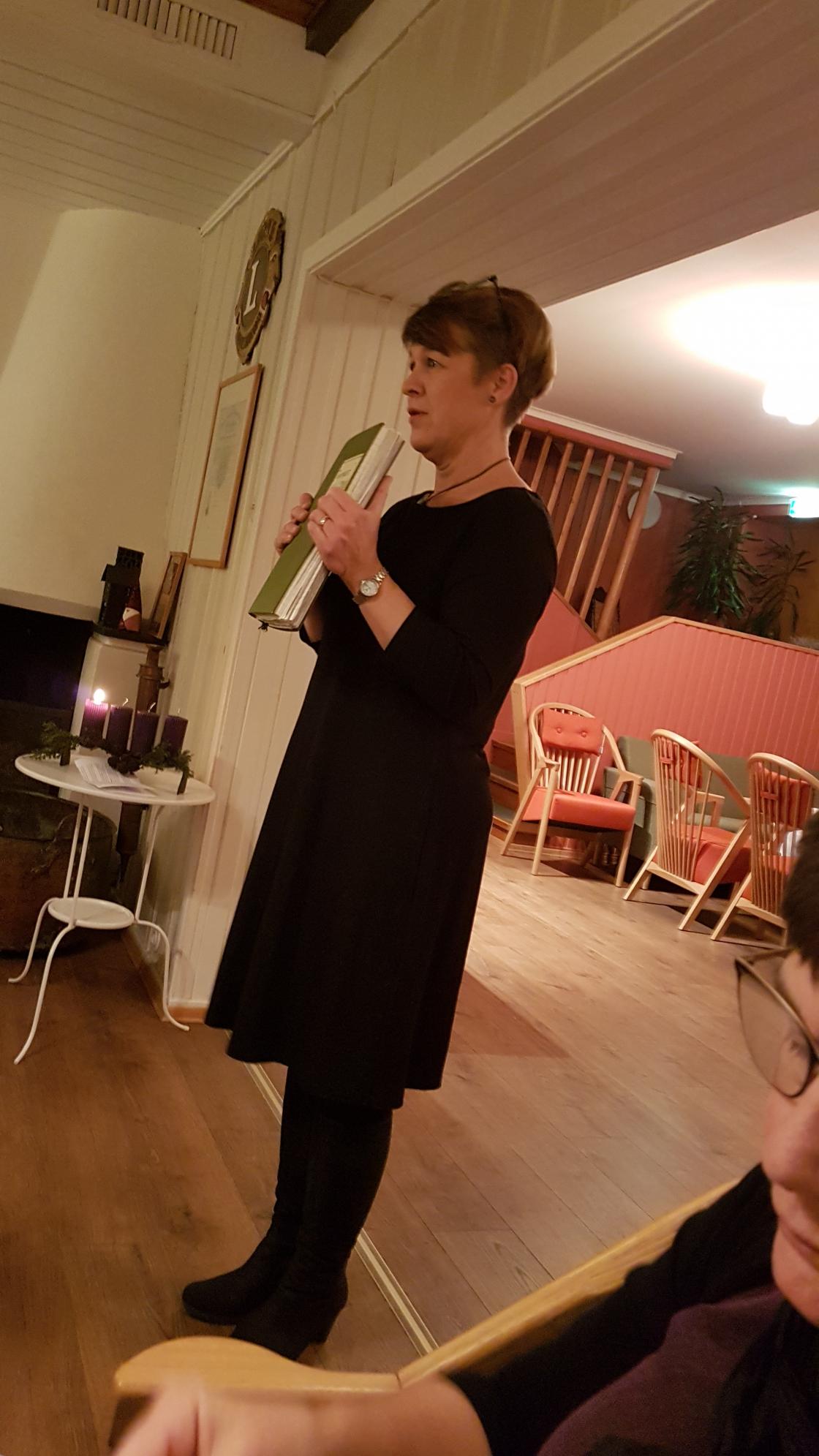 Vi ble ønsket velkommen og Anbjørg tente lys. Vi fortsatte inn til et julepyntet festbord. Den "røde stua" på Tingvang har blitt litt mindre rød og har fått nye flotte møbler. Det ble riktig så fint der.