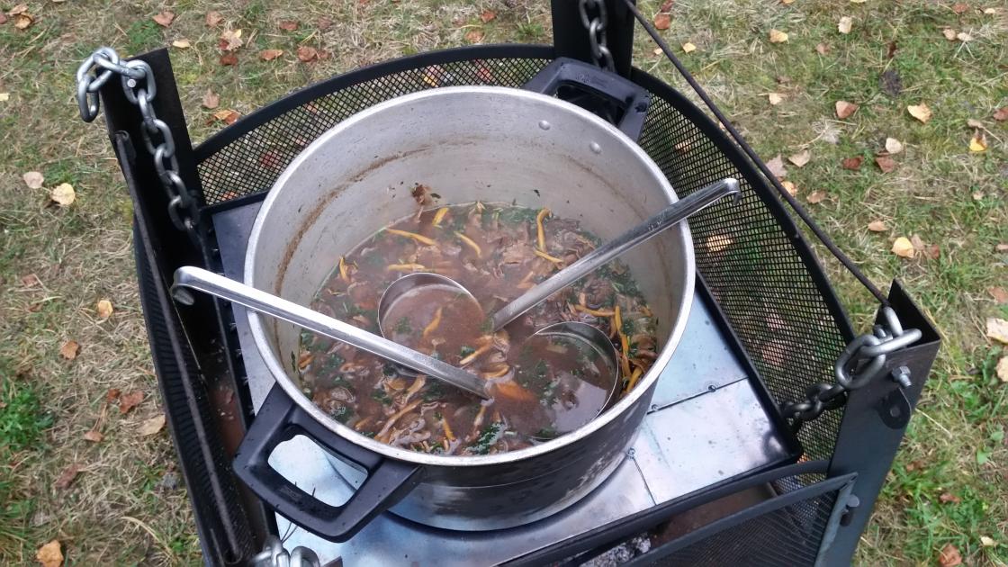 Vel tilbake på standplass var nydelig soppsuppe med traktkantareller på bålvarmen og vi nøt den varme suppa sammen med fersk hjemmebakst og god stemning.