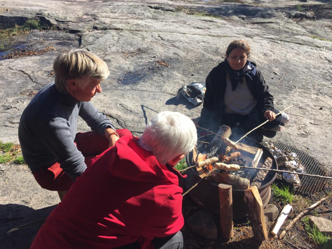 Vi hadde også en søt pinnebrøddeig, og Karin hadde laget til "Brimimat", lomper med fyll som ble varmet i folie på bålet. Karin hadde laget til en naturquiz, og våre nye turvenner, Gullala, Virginija og Khawla fikk en drikkekopp og en grillpinne i premie for deltagelsen.