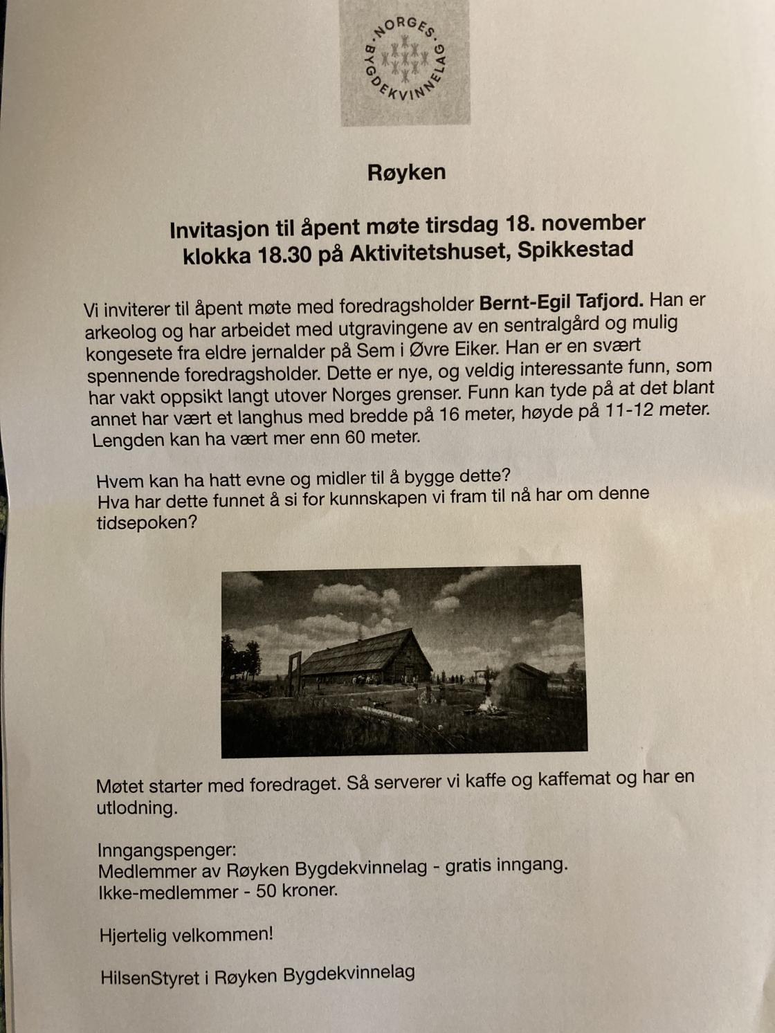 Forside Nov 18 Tue Røyken Bygdekvinnelag Åpent møte om utgravinger i Eiker Aktivitetshuset på Spikkestad tir 18.11.2025 18:30 - tir 18.11.2025 22:00 Del på: