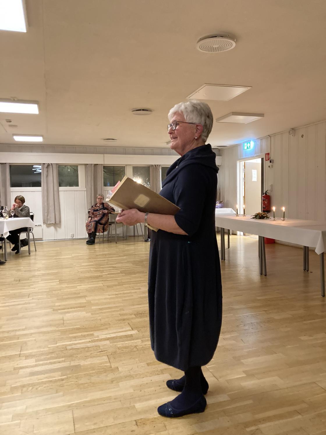 Anne Grethe Wiersholm fortalte om utviklingen i laget gjennom 100 år og leste ett artig referat fra en tut med forviklinger til Verdens Ende.