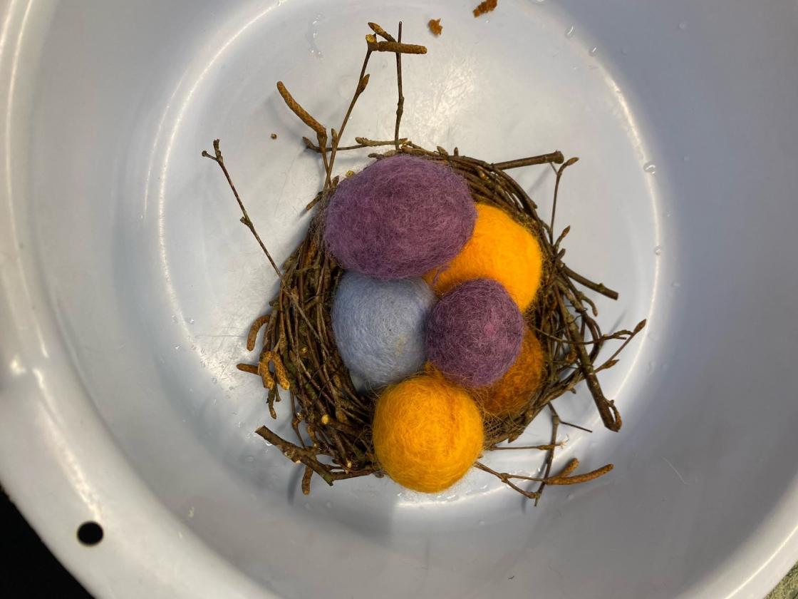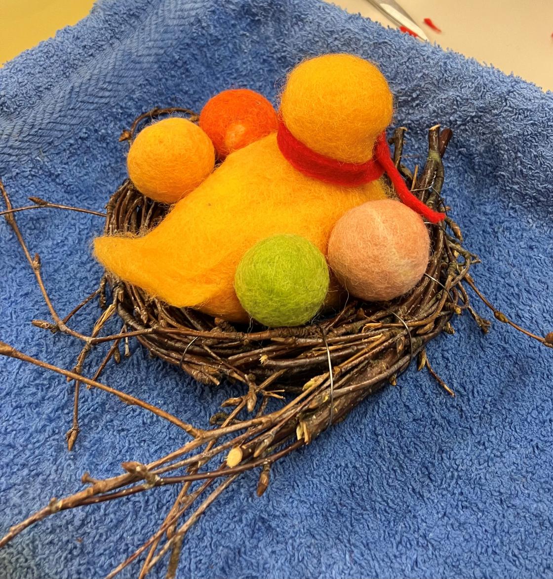 Stemningen var god og snart var alle i gang med tovinga. Det ble et flott utvalg av kyllinger og egg. Gro hadde i tillegg laget fuglereder av bjørk. Vi ble fornøyde med resultatene og hadde ikke minst en hyggelig kveld. Kaka til Karin smakte fantastisk!