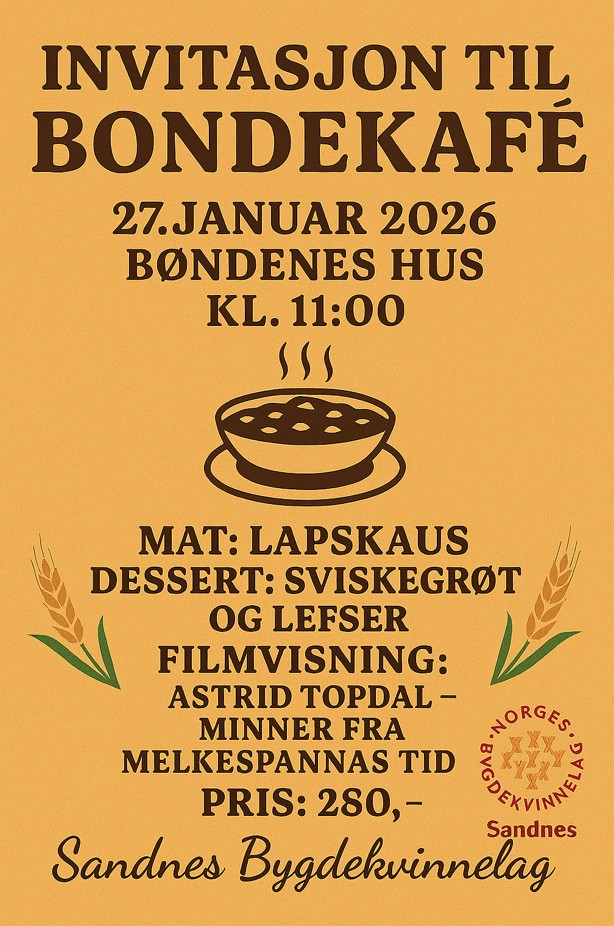 Forside MØTEREFERAT OM OSS STYRET Jan 27 Tue Sandnes Bygdekvinnelag Bondekafe Bøndenes Hus tir 27.01.2026 11:00 Velkommen til Årets Bonde kafe Invitasjon 2026_0.jpg Del på:
