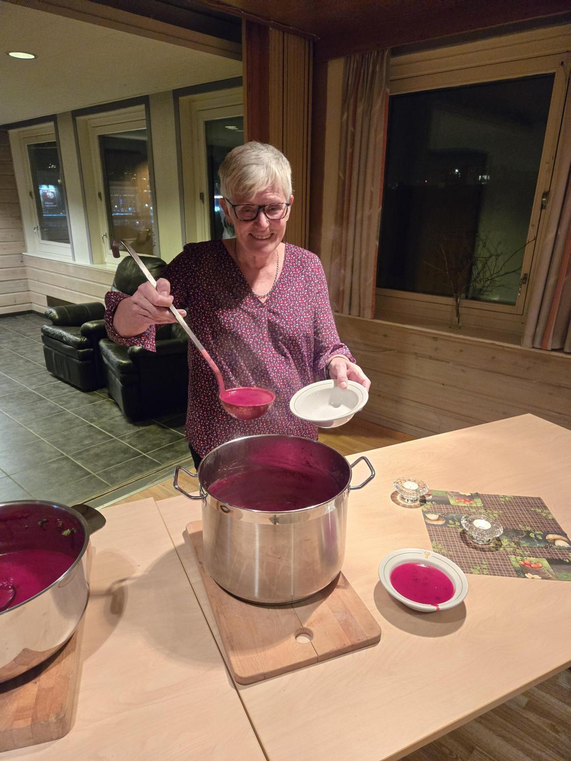 Vi sang før maten og vår veteran Målfrid Stangeland spilte for oss. Det ble servert deilig rødbetsuppe fra hefte til Margit Vea, med godt brød og smør attåt. Vårt indre økosystem fikk akkurat det den trengte på lagsmøte i Sandnes 👌