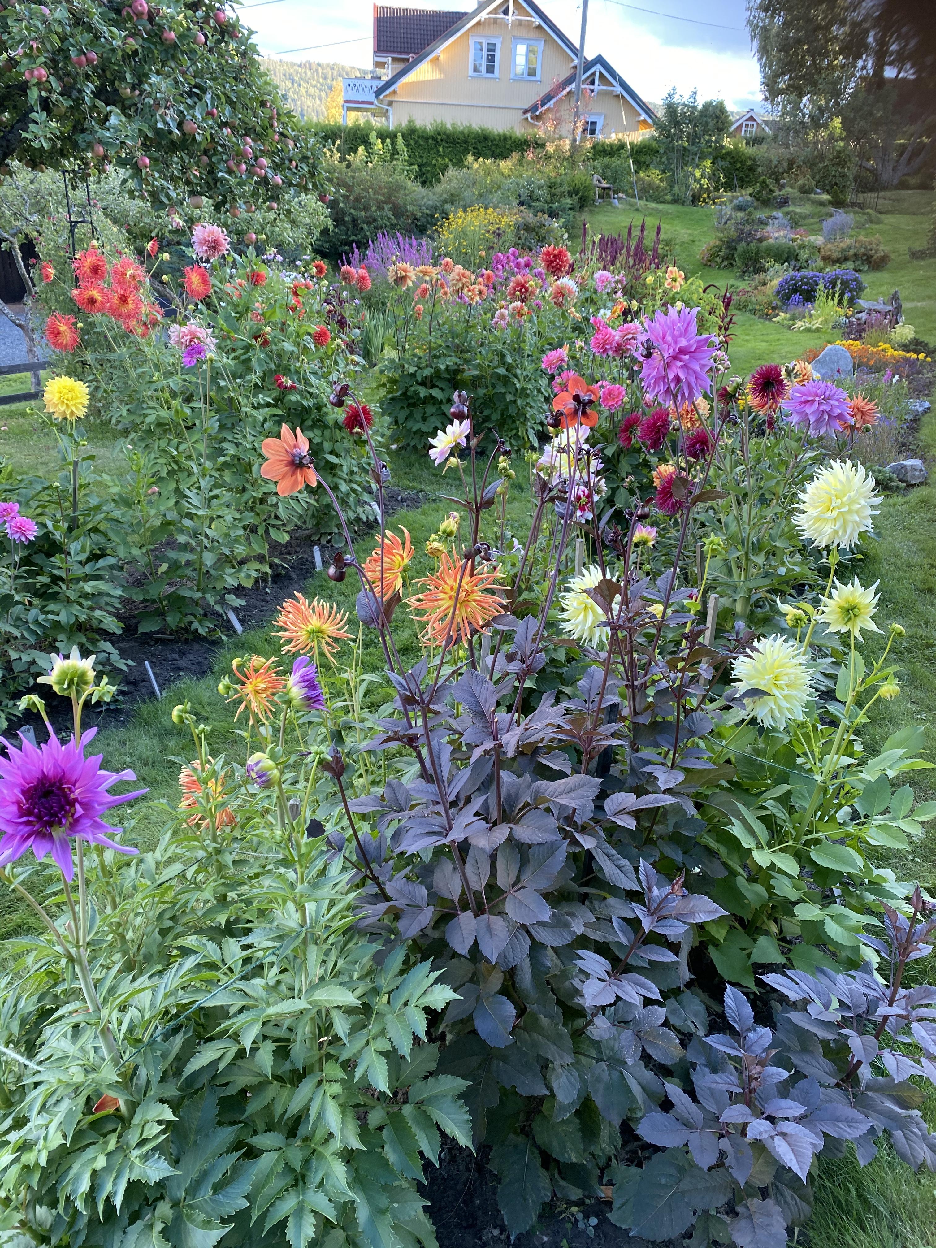 Gudbrand fortalte og viste oss rundt i sin flotte hage med vakre georginer, stauder, busker og dekorative steiner og detaljer. Et vakkert hageanlegg uten sidestykke.
