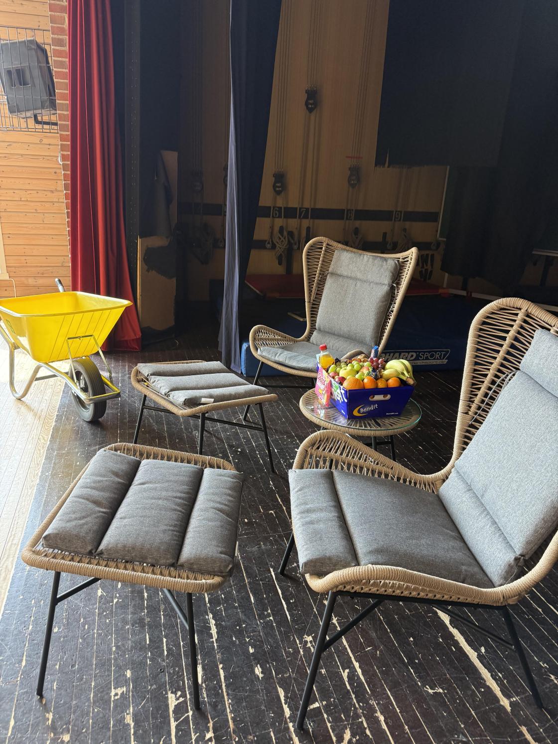 Best av alt var at tre av skolens lærere , med familier , hadde gjort klar alt av bord og stoler for oss . Vi er så takknemlige.