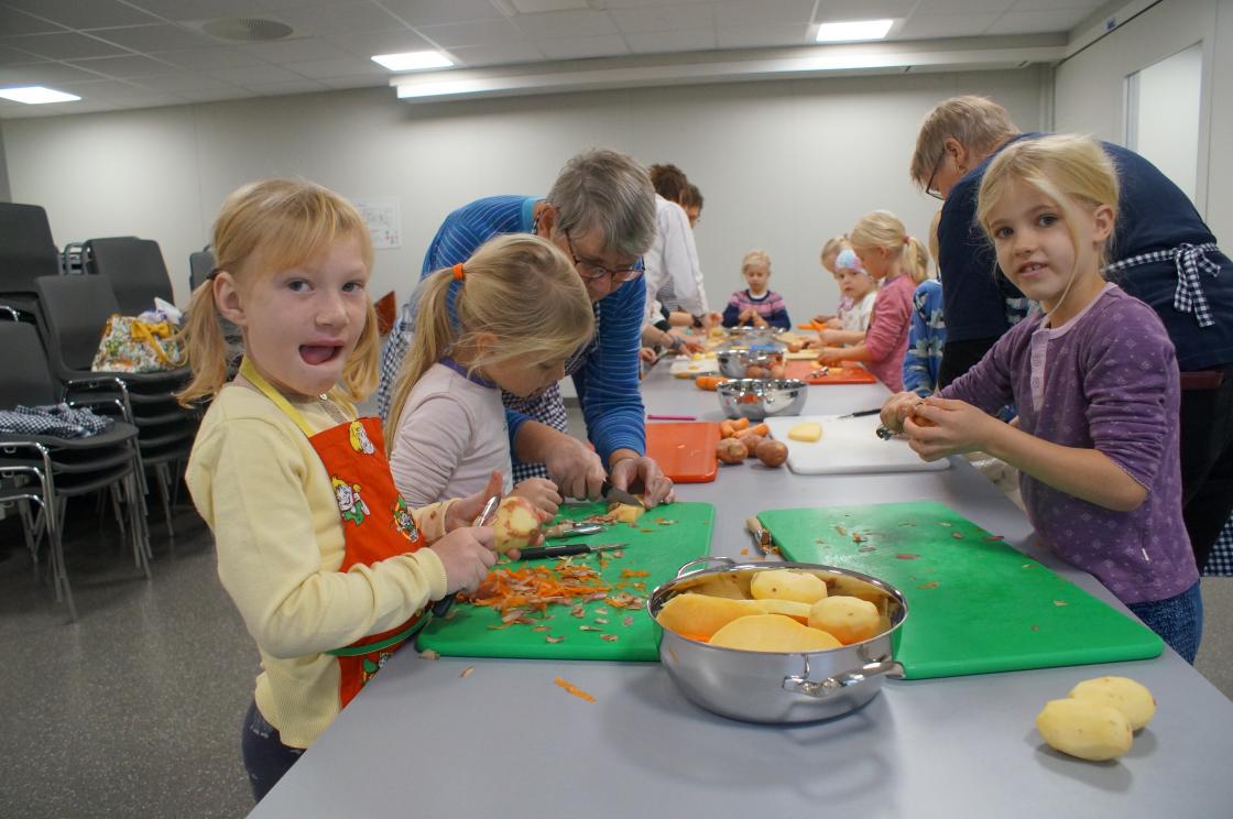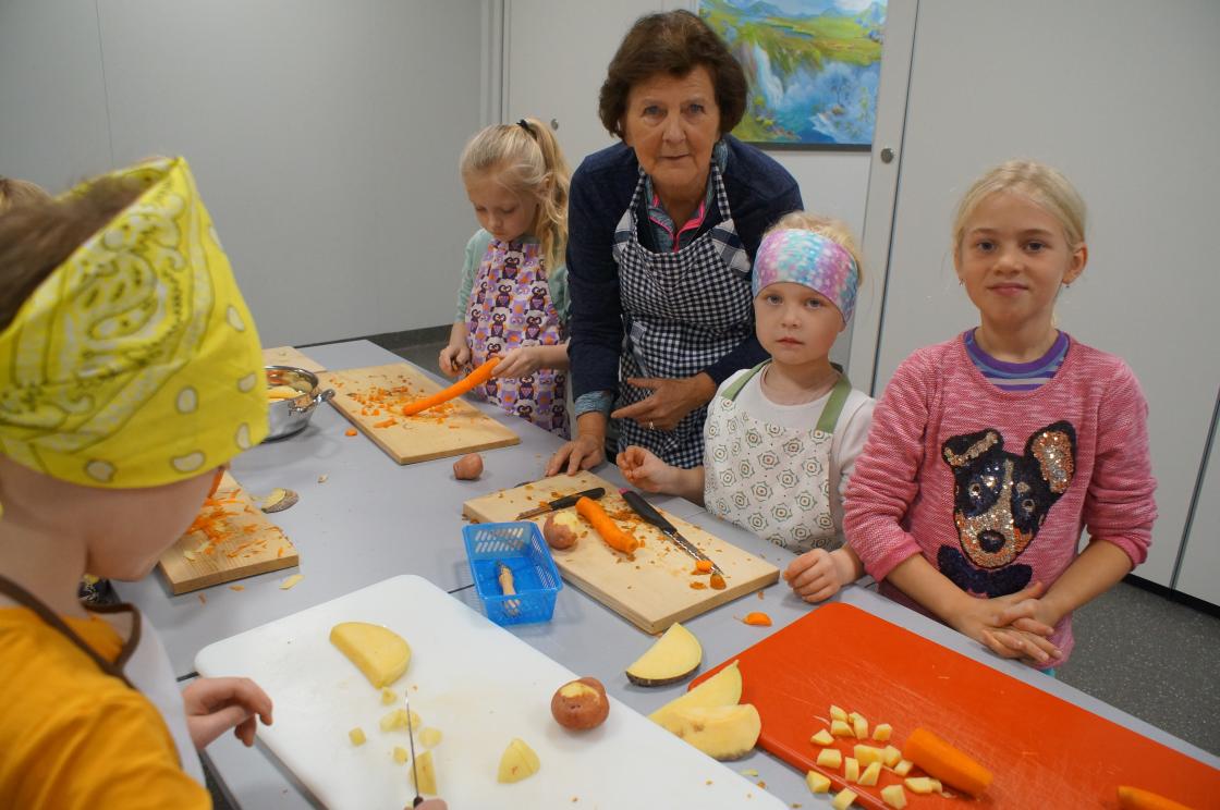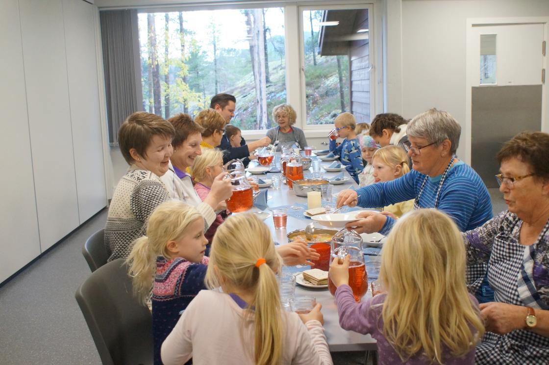 I dag har vi lært 1. og 2.klasse og laga betasuppe heilt fra bunnen. De skrelte og kutta opp gulrøtter, kålrot, poteter, purreløk, og pølser. Tilslutt hadde de i årets gryn,bygggryn og buljong til kraft. De var virkelig ivrige i jobben.Etter det dekka de sjøl bordet med fat og og glass og pynta med servietter. Deilig suppa blei det som og lærarane og rektor fikk servert. Ein fin dag for oss bygdekvinner som fikk væra med klassane.