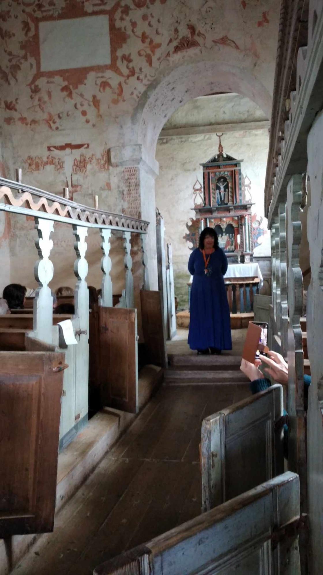 Det var oppmøte ved Moster gamle Kyrkje, der guide tok imot oss. Vi fikk omvisning i kirka som er ei steinkirke fra 1100-tallet og en av landets eldste kirker.