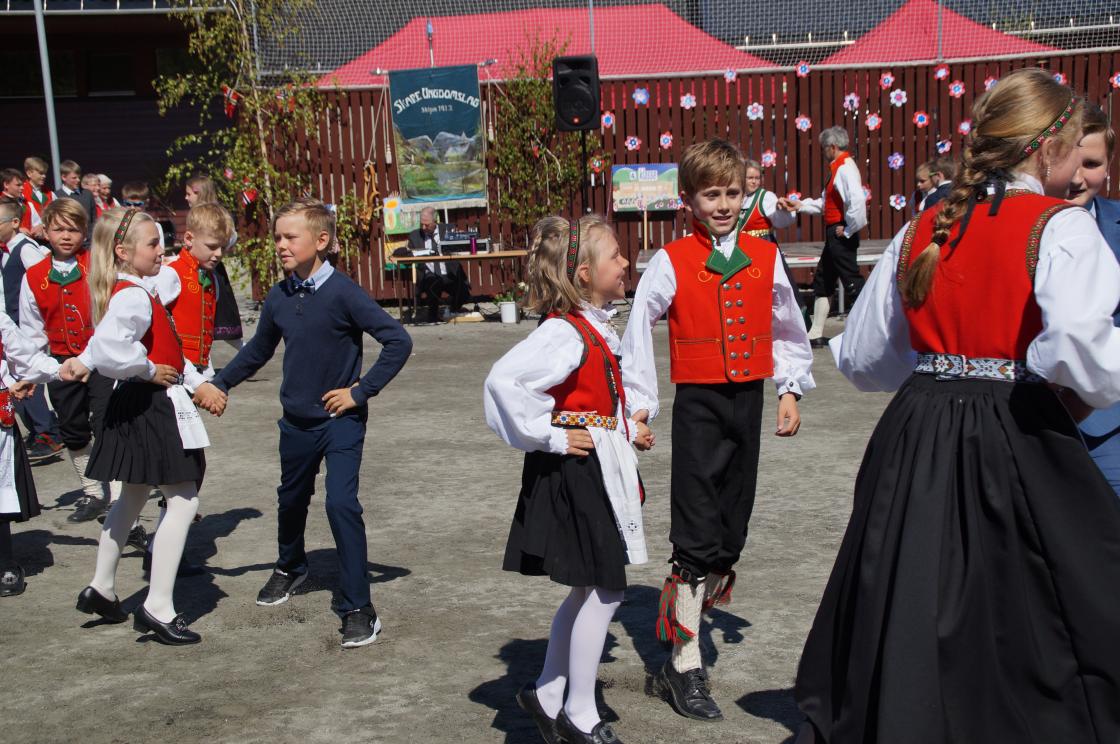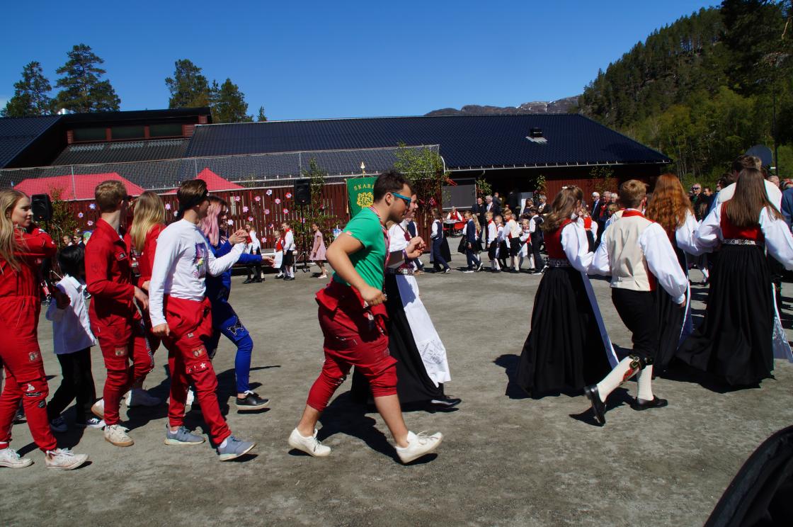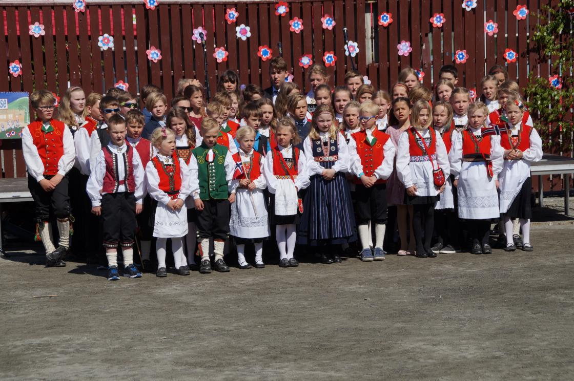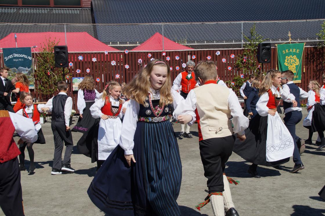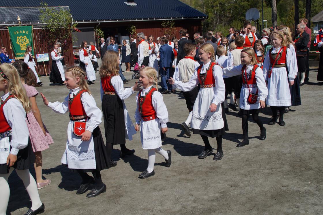 Det er 7.klasse (avgangsklassen) sammen med foreldre, besteforeldre, som kvart år lager i stand til den store dagen. Dei ønska oss velkomen og fortalte om tida si her på Skare Skule.