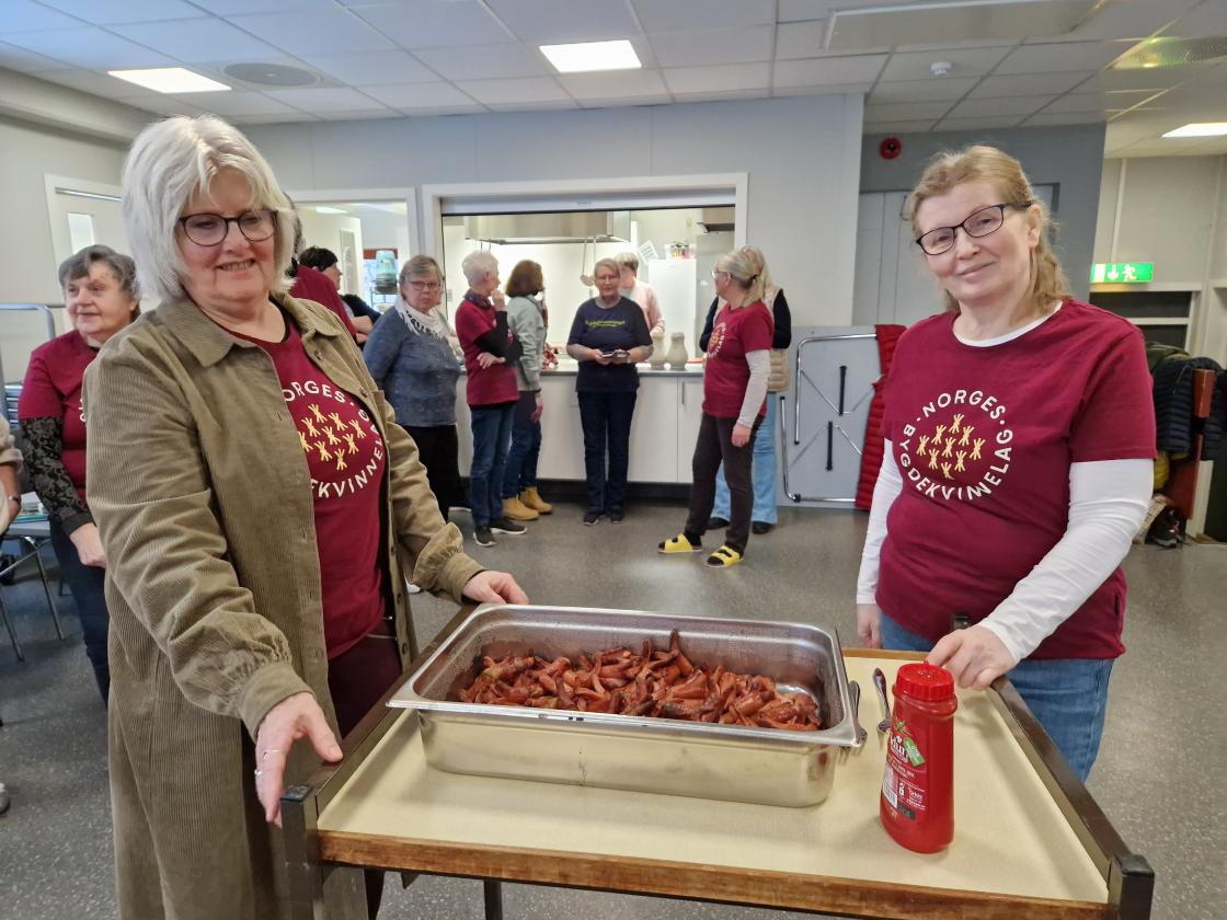 17 medlemmer møtte på grendahuset kl.0900. Alle tok til å jobba med ein gang. Bord skulle settes på plass. Fater skulle pyntes med tomater, agurk, salat og kjøttpålegg. Eggerøre lages, egg kokes, blekksprutpølser steikes. Havreboller, brødskiver og knekkebrød kom på plass.