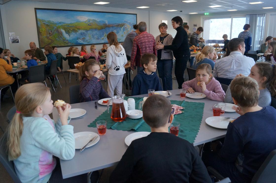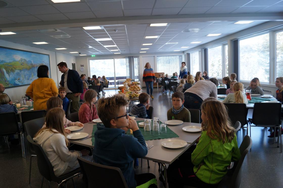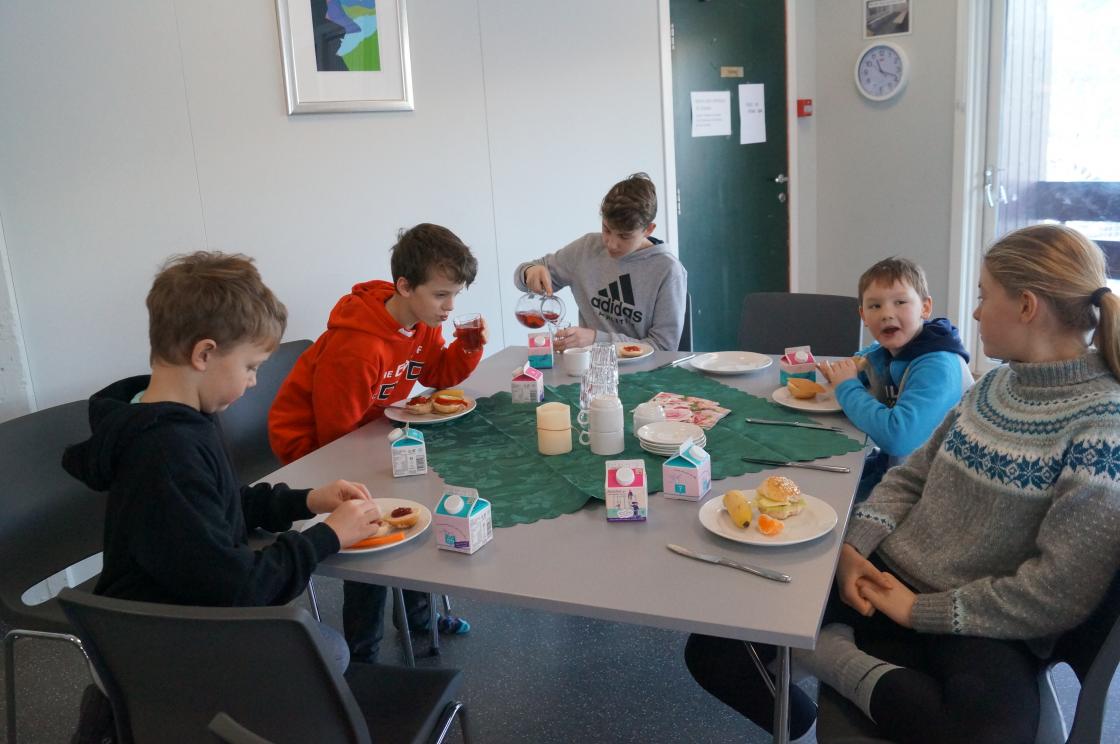 Lærerer og rektor kommer alltid, og i år fikk vi og besøk av oppvekstsjef Morten Vedvatne. Det satte vi pris på. Vi dekka langbord med alle slag pålegg, havreboller og brød. Og alle forsynte seg sjøl.