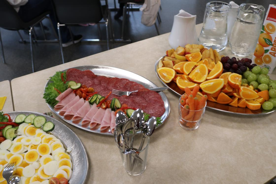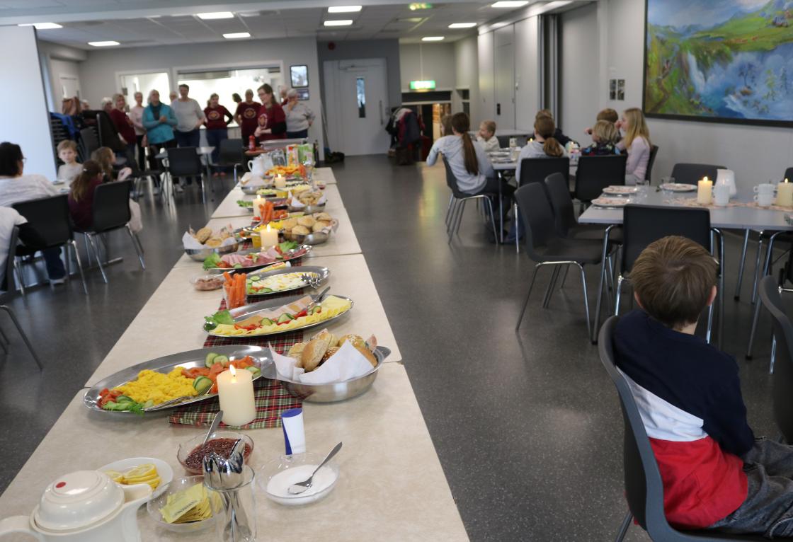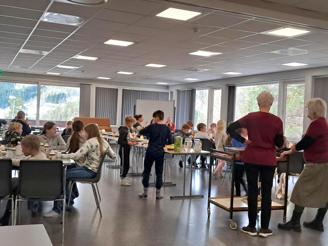 Både elever og SBK-damene gleder seg til denne dagen. Vi hadde dekket langbord til maten og småbord rundt. Gunvor ønsket velkommen og elevene sang for maten. 1. klasse fikk forsyne seg først. Det ble servert havreboller med masse godt pålegg, blekksprutpølser og et stort fruktfat med epler, appelsiner og druer. Elevene koste seg og spiste godt. De var veldig flinke til å rydde av bordene. Tusen takk alle sammen.