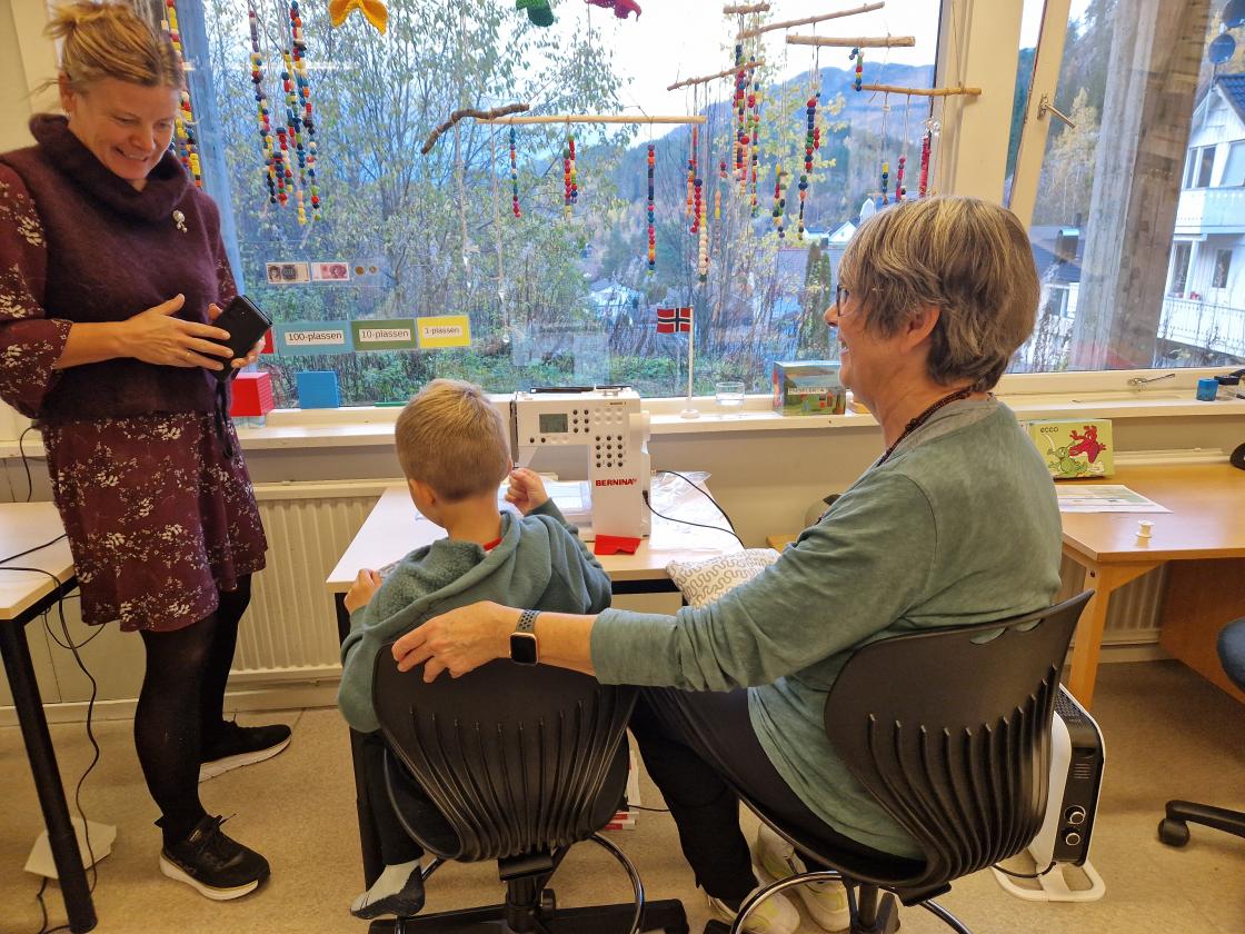 I sygruppa hjalp me elevane med å sy på symaskin. Elevane hadde på forhand samla inn stoffer. Gjenbruk av dukar, gardiner og andre stoff. Dei forma mønster og klipte ut. Nåla og tråkla alt klart til sying. Maskinsaum, god vatt inni, og det blei mange flotte og fargerike puter.