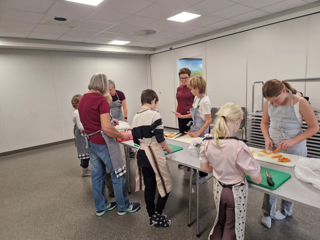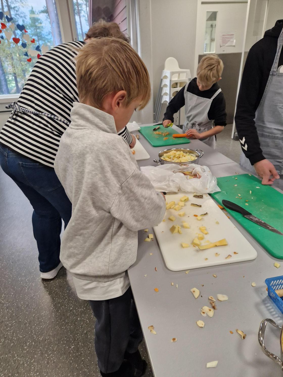 Ein gjeng av oss var til hjelp på kjøken. Me gjorde klar grønsakene slik at elevane kunne skrella og skjæra dei opp i passe bitar. Flinke og ivrige var dei.