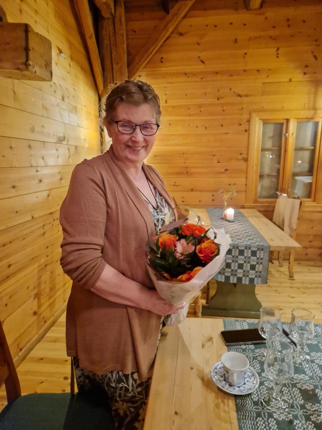 Gunvor ønsket velkommen. Mellom hovedrett og dessert leste Kari fra Framsteg - lagsbladet vårt. Det var oppsummering av 75 års historie fra starten og til idag. Det viste et bygdekvinnelag som har bidratt med mye forskjellig i bygda. I løpet av disse 75 årene har det kun vært 12 lederer. Margot og Gunvor har begge vært ledere i 20 år. Gunvor fikk overrakt blomster. Margot kunne dessverre ikke være med, men Tone og Kari ville ta turen på søndag med blomster og kake.